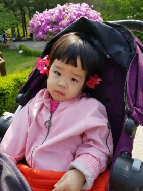 주아가 분홍색 꽃에 특히 관심을 많이 보여서 떨어진 철쭉 꽃잎을 귀에 꽂아주었더니 시무룩한 표정 한컷!
