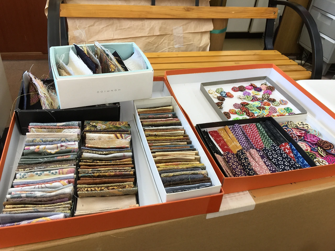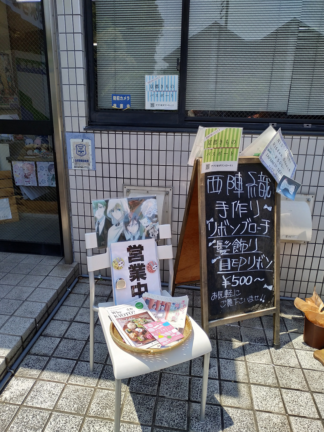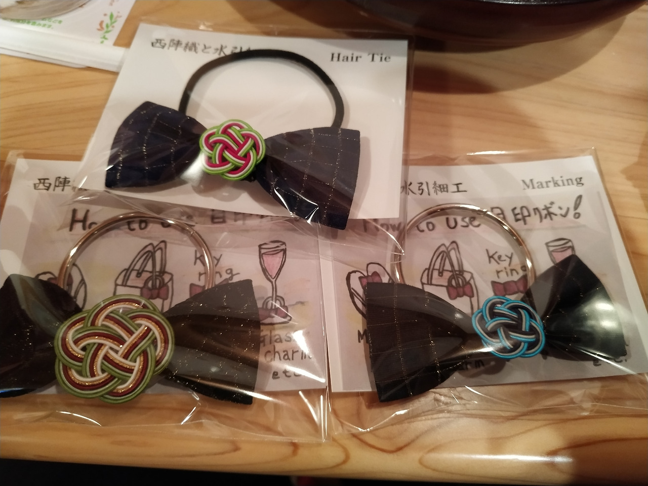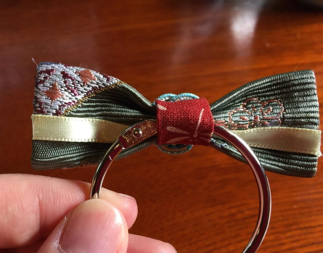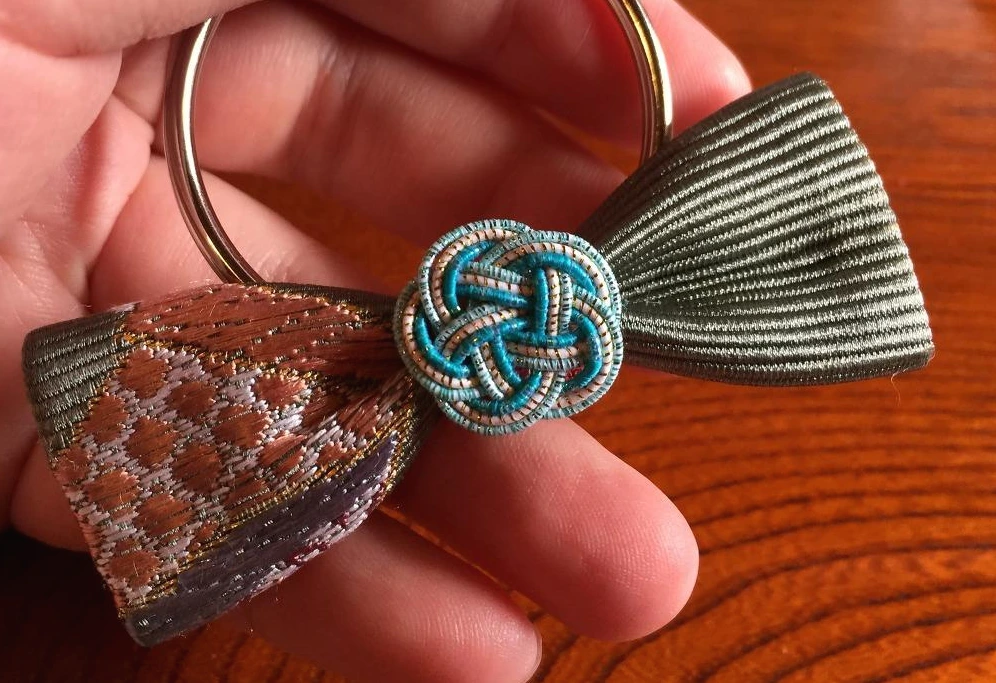 제대로 된 간판도 없는 이곳에 들어가면 니시진오리(西陣織)라고 하는 천과 미즈히키(水引)라고 하는 전통 매듭을 사용해서 리본을 만들 수 있도록 되어있다. 내가 원하는 천과 매듭을 고르면 알아서 만들어주는 형식.