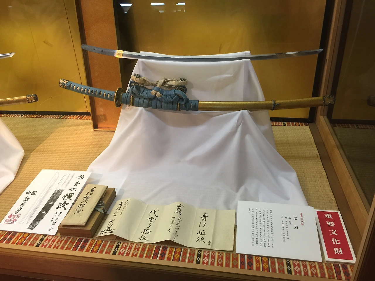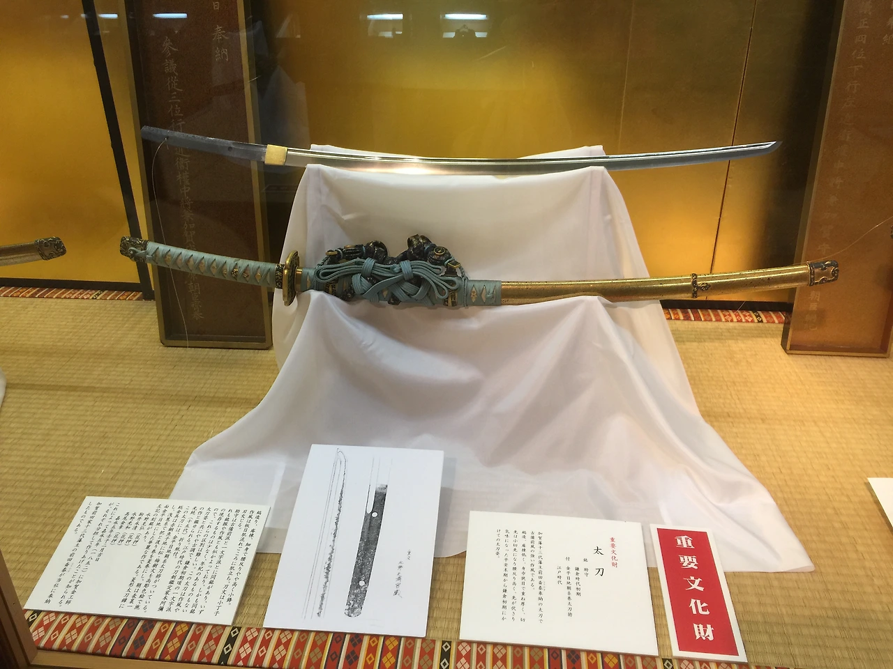 가장 왼쪽이 이 신사가 보유한 검 중 가장 유명한 오니기리마루이며, 오른쪽 두 자루는 마에다 집안에서 봉납한 일본도다. 모두 중요문화재로 등록되어있는데, 이런 문화재를 이렇게 가까운 거리에서, 카메라로 찍어가며 볼 수 있는 곳은 정말 드물다. (많은 박물관의 경우 문화재는 사진 촬영 금지다) 누군가가 이 신사를 들른다면 꼭 전시도 보길 바란다.