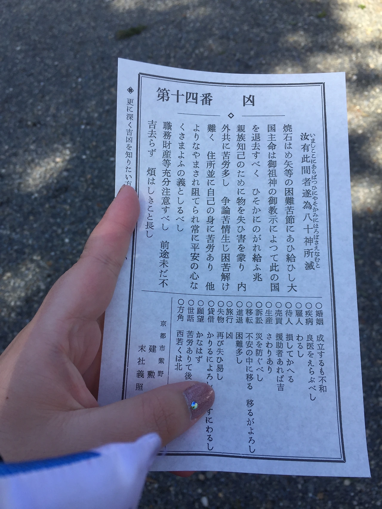 유난히 흉이 많이 나오는 오미쿠지라고 쓰여있는 문구를 보고 웃으면서 뽑았더니 정말로 흉이 나와서 놀랐었다. 내가 놀라서 잠시 멈춰있으니, 신사를 지키는 분께서 "앞으로 잘 될 점괘가 나왔나 봐요" 하고 좋게 말씀하셔서 웃으면서 묶어두고 왔었다. 참 신기한 것이, 이때 오미쿠지는 정말로 잘 맞아떨어졌어서, 당시 상반기는 정말 인생에서 가장 힘든 시기를 보냈었다. 이 여행 바로 뒤에 들어간 회사가 블랙 회사여서 엄청나게 고생을 했는데, 다행히 금방 다른 직장으로 옮기고, 그해 가을 교토로 다시 한번 여행을 올 수 있었다. 그때 이곳에 들러서, 힘든 시기를 벗어날 수 있도록 도와주셔서 감사하다는 인사를 했었다. 이렇게 몇 번이고 오다 보니, 당연하게도 교토를 올 때마다 이 신사를 들르고, 인사를 하게 되었다.