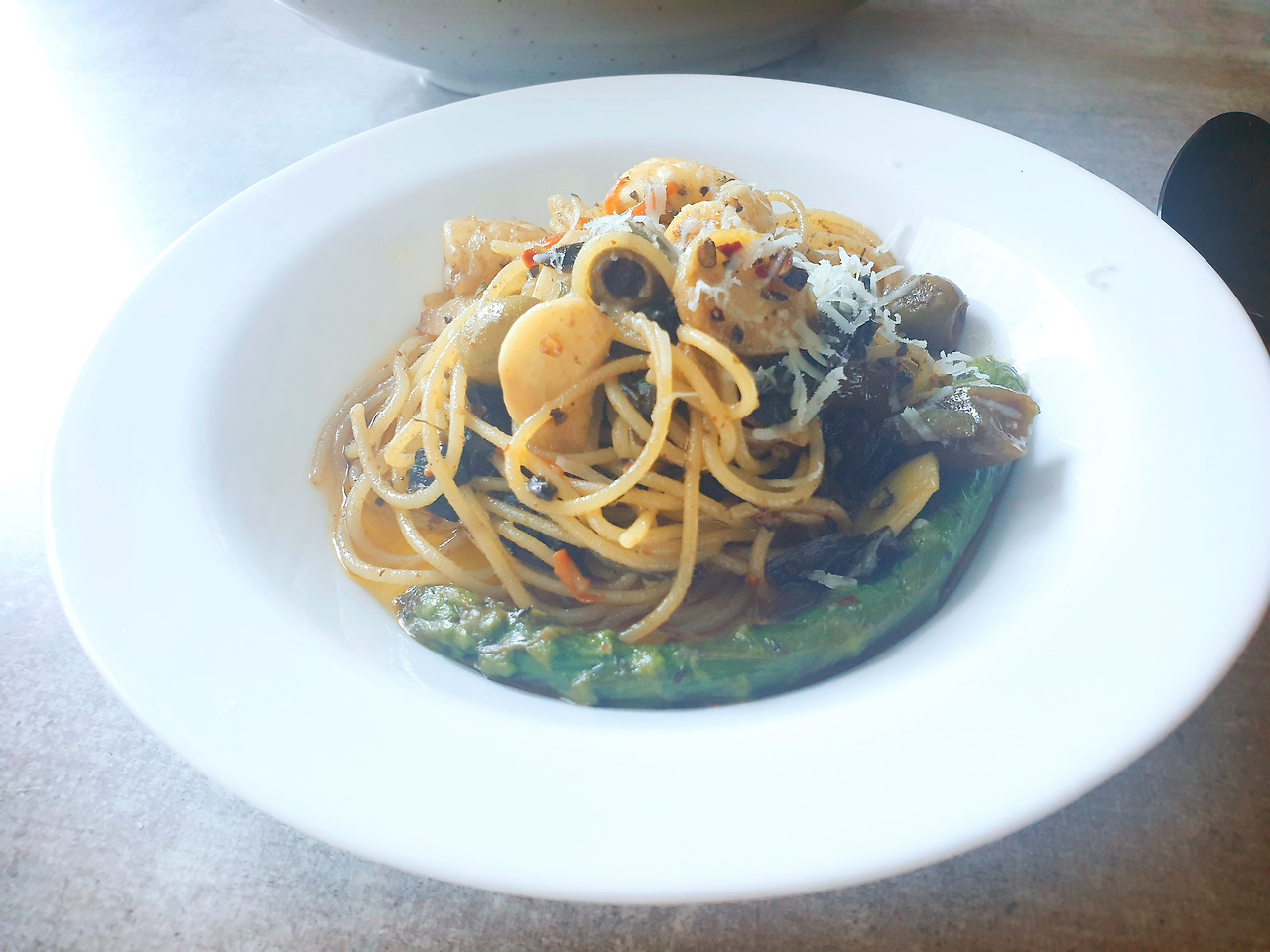 재료 : 앤쵸비와 앤쵸비 페이스트, 아보카도 오일, (목초 버터), 파스타면, 편 마늘 한 줌, 올리브 한 줌, 냉동 아스파라거스 한 대, 페페론치노 가루 약간, 히말라야 솔트 약간, 통후추, 바질가루, 파르미지아노 레지아노 치즈
