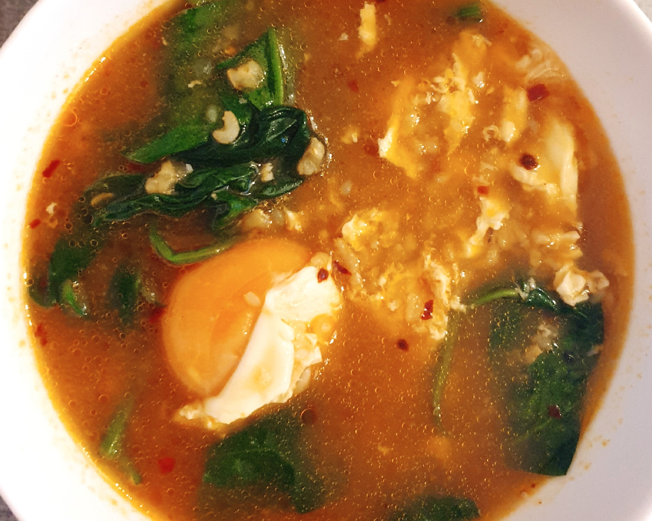 1. 둥근 팬에 아보카도 오일을 두르고 페페론치노를 넣어 고추기름을 낸다. (센 불로 하면 금세 타버리니 조심)2. 끓인 물을 붓고, 라면수프를 적당량 넣는다.3. 현미곤약밥을 넣어서 팔팔 끓이다가 불을 끄고, 계란을 깨서 넣고 시금치를 넣어 뚜껑을 닫아 잠시 둔다.4. 이제 접시에 담아서 먹으면 된다.