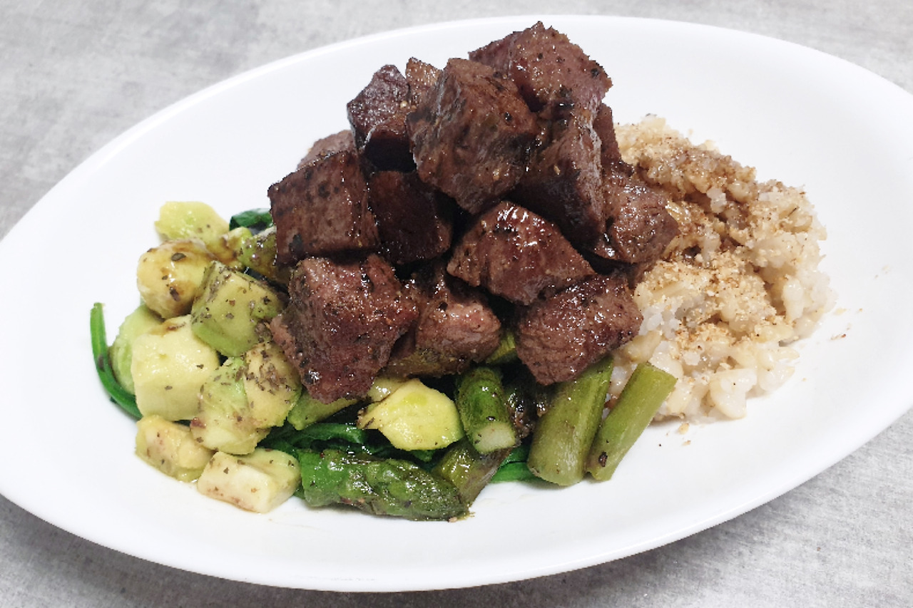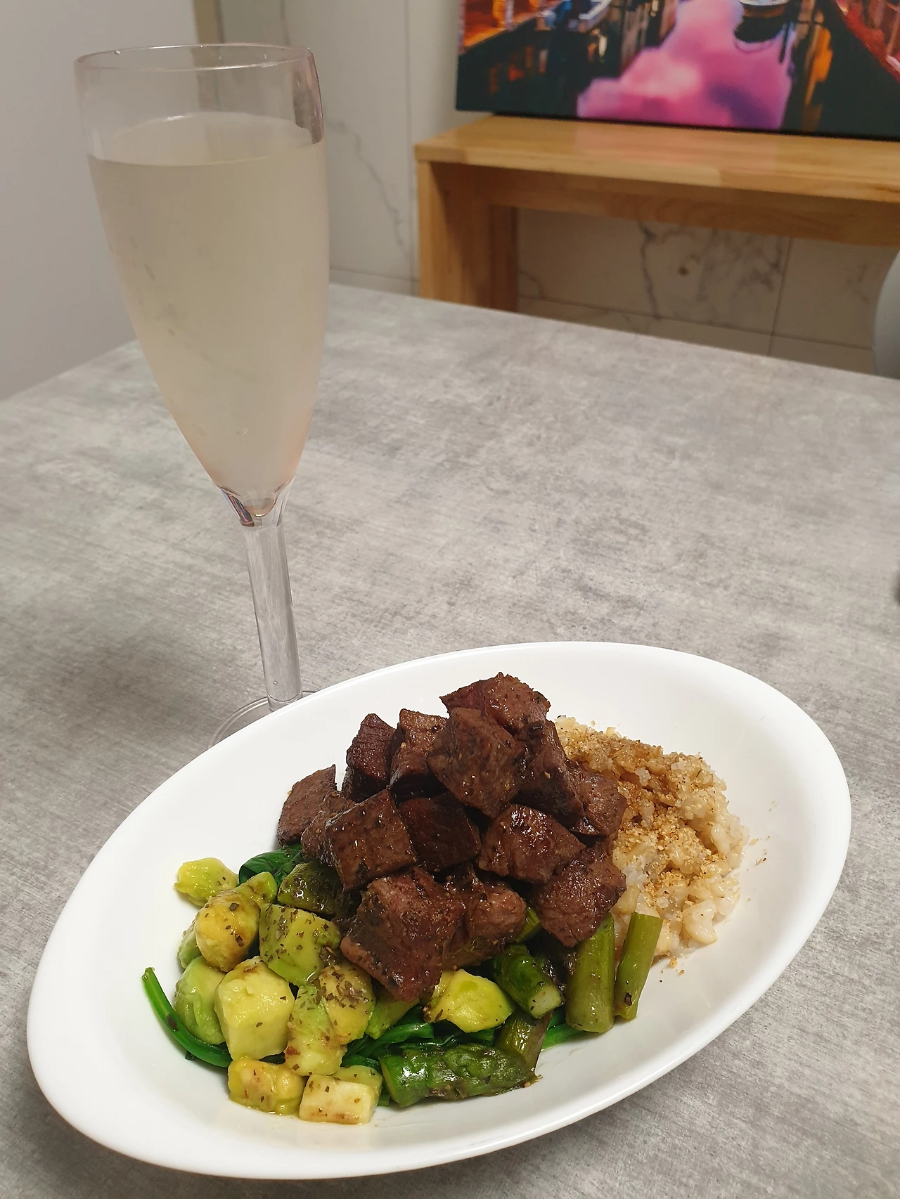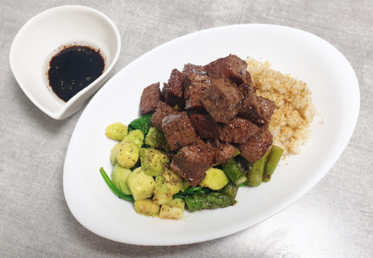 2. 준비된 스테이크는 예열된 에어프라이어에 시어링을 한 후, 버터를 넣고 아보카도 오일을 두른 프라이팬에 (아스파라거스와 함께) 넣어 굽는다.