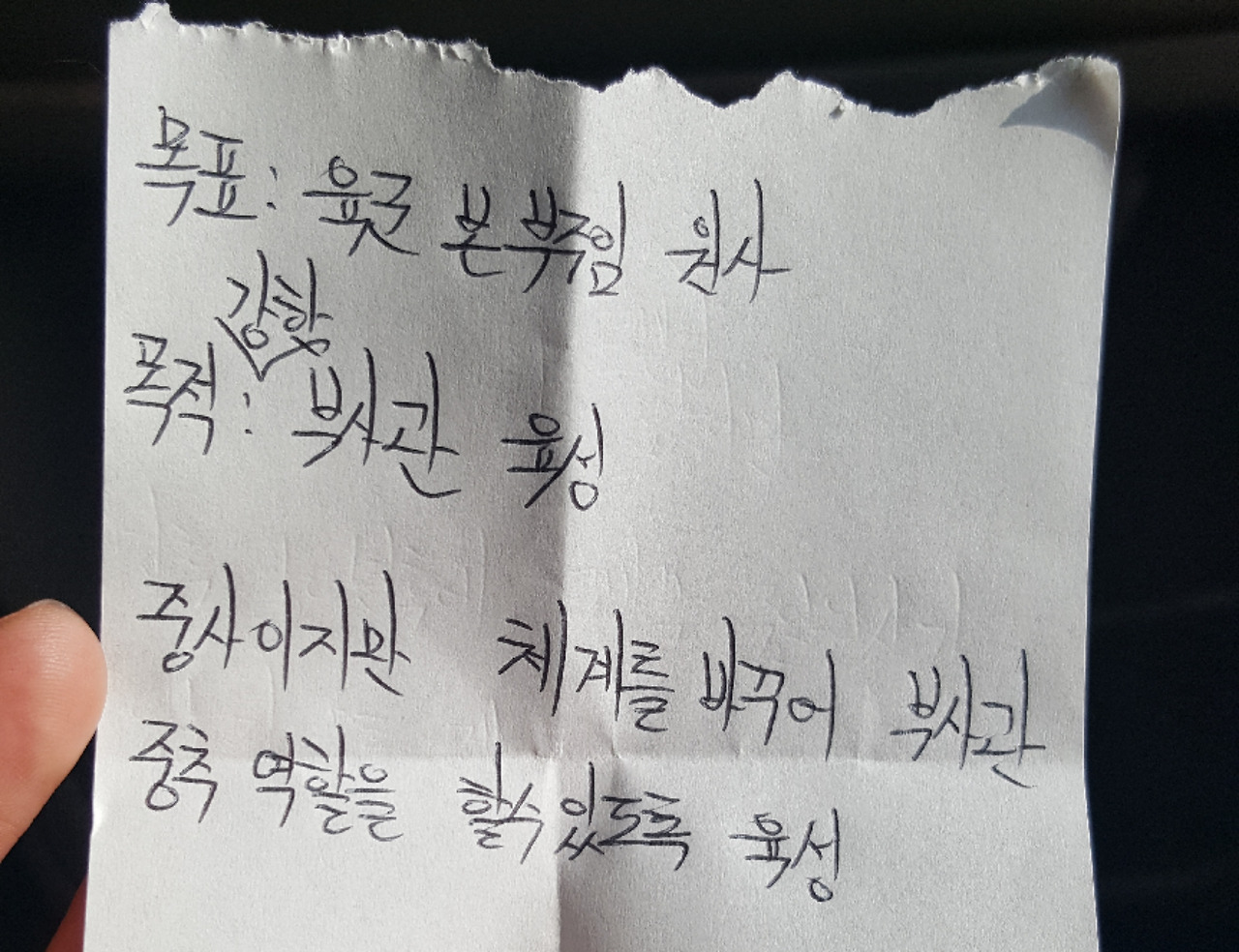 아... (감탄으로 시작) 이 분들을 마지막으로 넣은 것은, 의도적이었다. 왜냐하면 이분들이야말로 이 글의 대미를 장식할만한 멋진 분들이기 때문이다. 특수부대도 아니고, 어쩌면 그저 많고 많은 육군 장병들 중 하나의 중대에 불과할 수 있지만, 나는 정말 큰 감명을 받았다. 특히 이 곳의 어느 부사관 분께. 우리 국군 중 최고의 전투요원을 선발하는 대회에서 최고 전사(?) 자격을 획득하신 분인데, 인터뷰를 하다가 어쩌다 보니 군 생활의 목표가 무엇인지를 질문하게 되었다. 그런데 고민 고민 머뭇머뭇하시다가 결국 내가 집요하게 물어보자, 쑥스럽다며 아무에게도 말하지 말고 혼자서 보라고(?) 수줍게 종이에 적어서 주시는 거다. 그 종이에는 꾹꾹 눌러쓴 듯한 투박한 글씨로 이렇게 쓰여 있었다.