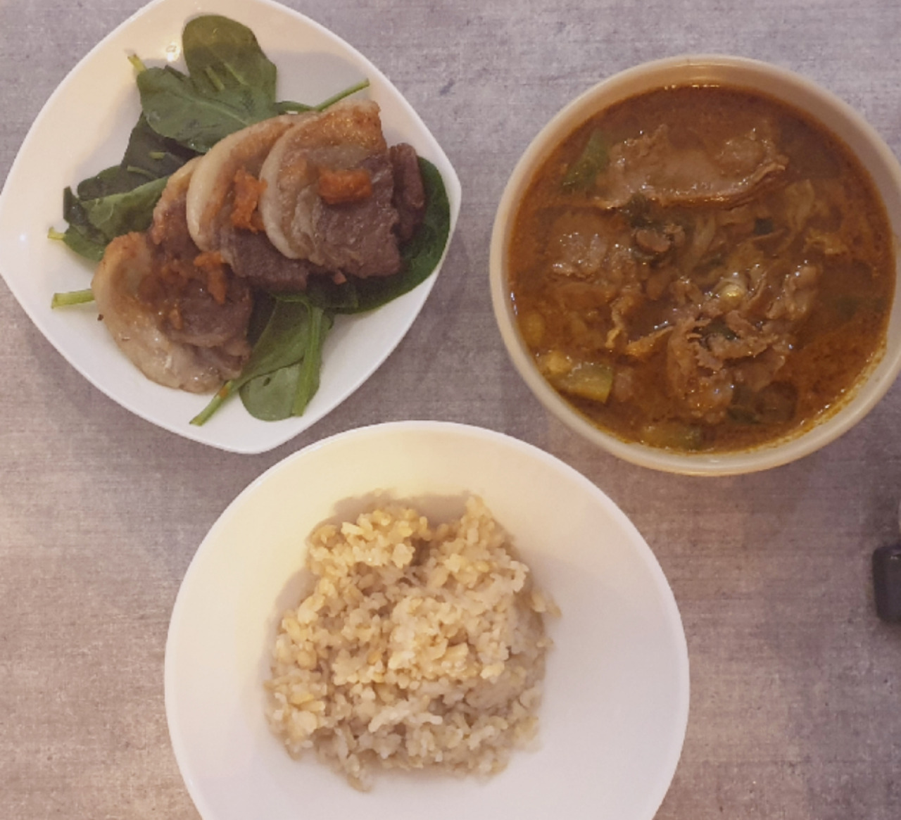 재료 : 차돌박이(또는 우삼겹) 원하는 만큼, 어슷썰기 해서 얼려둔 파, 깍둑 썰기한 애호박 약간, 맛있는 된장 한 큰 술, 고추장 반 큰 술, 표고버섯 가루, 다시마 가루, (설탕 대신) 스테비아 약간, 물 만드는 법 : 재료를 다 넣고 푹 끓이다가, 먹기 전에 들기름과 MCT 오일을 뿌린다.조리시간 : 15분