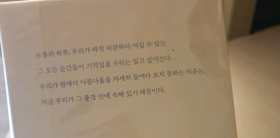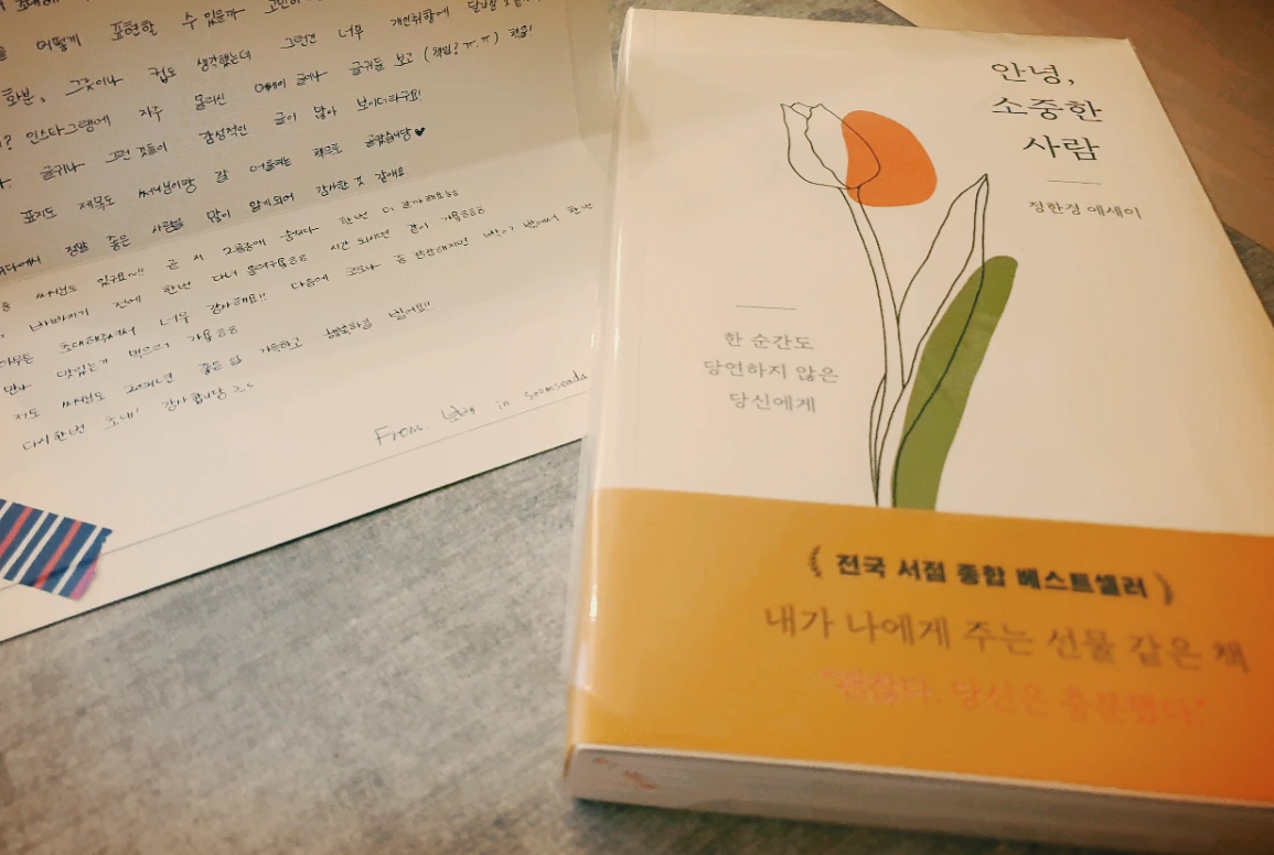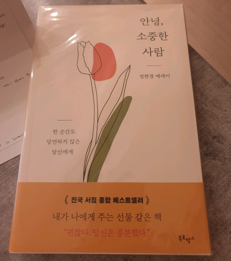 그렇게 우리는 각자의 삶을 열심히 살다가, 멋진 저녁 시간을 보내기 위한 준비를 갖추고 모였다. 그녀들은 마치 약속이나 한 듯이, - 내가 부탁했던 디저트와 음료 외에도 - 선물을 가지고 왔다. 너무나 멋진 제목의 책 - 정한경 씨의 '안녕, 소중한 사람'이라는 책인데, 표지에 '한 순간도 당연하지 않은 당신에게'라는 문구가 마음에 와 닿았다 - 과 오랫동안 고심한 티가 역력한 와인. 그것도 너무 기뻤는데, 정성스럽게 쓴 쪽지와 카드가 들어있어서 정말 많이 놀랐다. 누군가에게 편지를 쓴다는 것이, 그리 쉬운 일이 아니라고 생각했기 때문이다. 그래서 그 작은 편지와 카드로 인해, 나는 감동을 받았다.