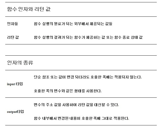 이렇게 원래 리턴 해야 하지만 값이 여러 개여서 인자가 되어 주소 값으로 사용된 인자를 output 타입의 인자라 합니다. 반면 단순히 함수 실행 중 단순 참조의 의미를 갖는 인자를 input 타입의 인자라고 합니다.