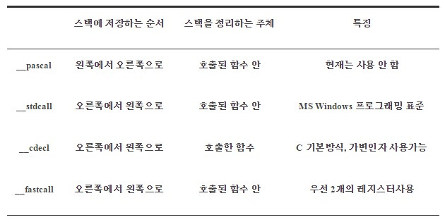 함수를 호출할 때는 기본적으로 First Input Last Output의 데이터 입출력 방식으로 자료를 다루는 스택을 사용하게 되고 스택을 사용하는 방식에 따라 __cdecl, __pascal, __stdcall, __fastcall 등이 존재합니다.