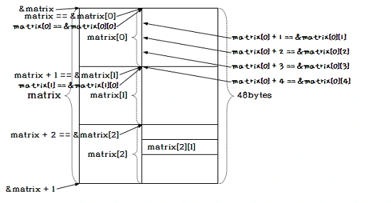 matrix와 가장 가까운 첫 번째 배열 연산자에서는 matrix(==&matrix[0])가 주소입니다.