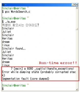 아래는 그림은 cygwin에서 gcc로 컴파일 한 후 실행한 결과입니다.
