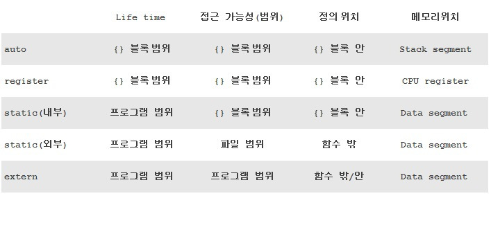 auto: 자동변수로 메모리 stack segment에 저장됩니다. 반드시 {} 블록 안에서 선언해야 합니다. 접근 범위와 라이프 타임도 {} 블록과 동일하며 보통은 생략하는 것이 일반적입니다. 많은 사람들이 지역변수라고 부르지만 사실 그것은 잘못된 호칭이며 자동변수라고 부르는 것이 정확한 표현입니다.
