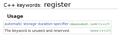 register - automatic storage duration. Also hints to the compiler to place the object in the processor's register. (deprecated) 라고 하고 있습니다. C가 아니라 C++입니다.