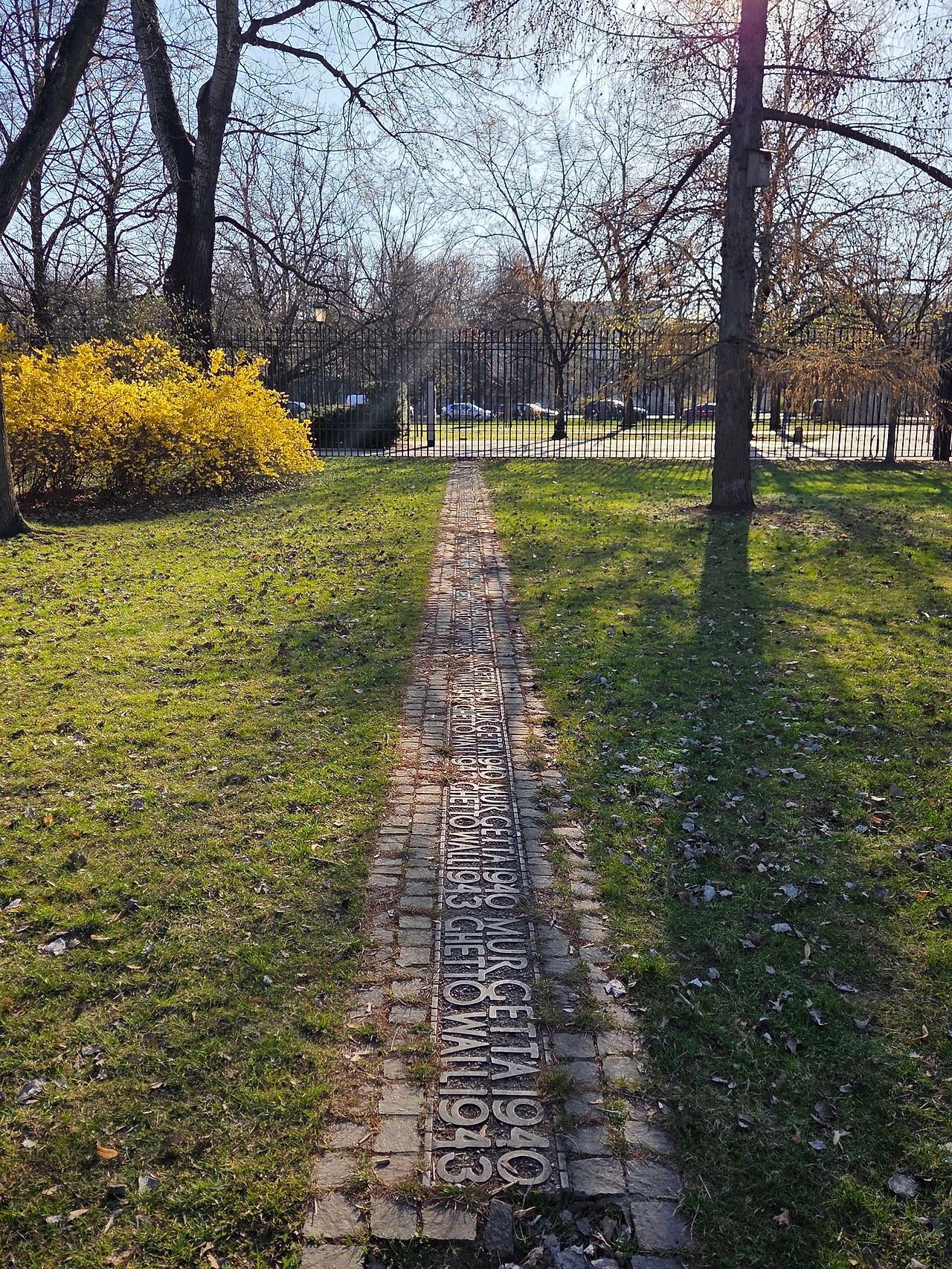 3월 말, 봄바람이 불던 어느 날(안타깝게도 4월 초인 지금은 우박이 내리고 바람이 많이 불어 날씨가 좋지 않다), 나는 와지엔키 공원 말고도 새로운 곳을 찾아보겠노라 마음먹었다. 공원이 이렇게 많은 이 나라, 예쁜 곳들을 모조리 찾아내겠다는 나의 의지였다. 토마토 파스타를 먹으면서, 구글 지도를 한참 들여다보고 있는데, ‘바르샤바 게토 장벽’이라는 곳이 눈에 띄었다. 내가 사는 곳은 제2차 세계대전 당시 폴란드 내 유대인들을 게토라는 지역에 모아놓고, 그들이 열악한 생활을 하도록 독일 나치군이 차별해 놓은 지역이었다. 그러다 보니, 지나가다 보면 바닥에 Ghetto Wall 1943이라는 글자가 길에 나있는 것을 심심찮게 볼 수 있는데, 그게 바로 전에 유대인들만이 살 수 있는 구역을 벽으로 구분 지어놓은 역사의 흔적이다. 바르샤바 게토 장벽은 꽤 큰 정원으로 둘러싸여 있는데, 그 정원의 이름이 ‘크라신스키 정원’이다. 갑자기, 궁금증이 머릿속으로 치고 들어왔고, 집에서 20분만 걸으면 갈 수 있다고 하니, 가지 않을 이유가 없던 나는 책을 하나 챙겨서 밖으로 나왔다.