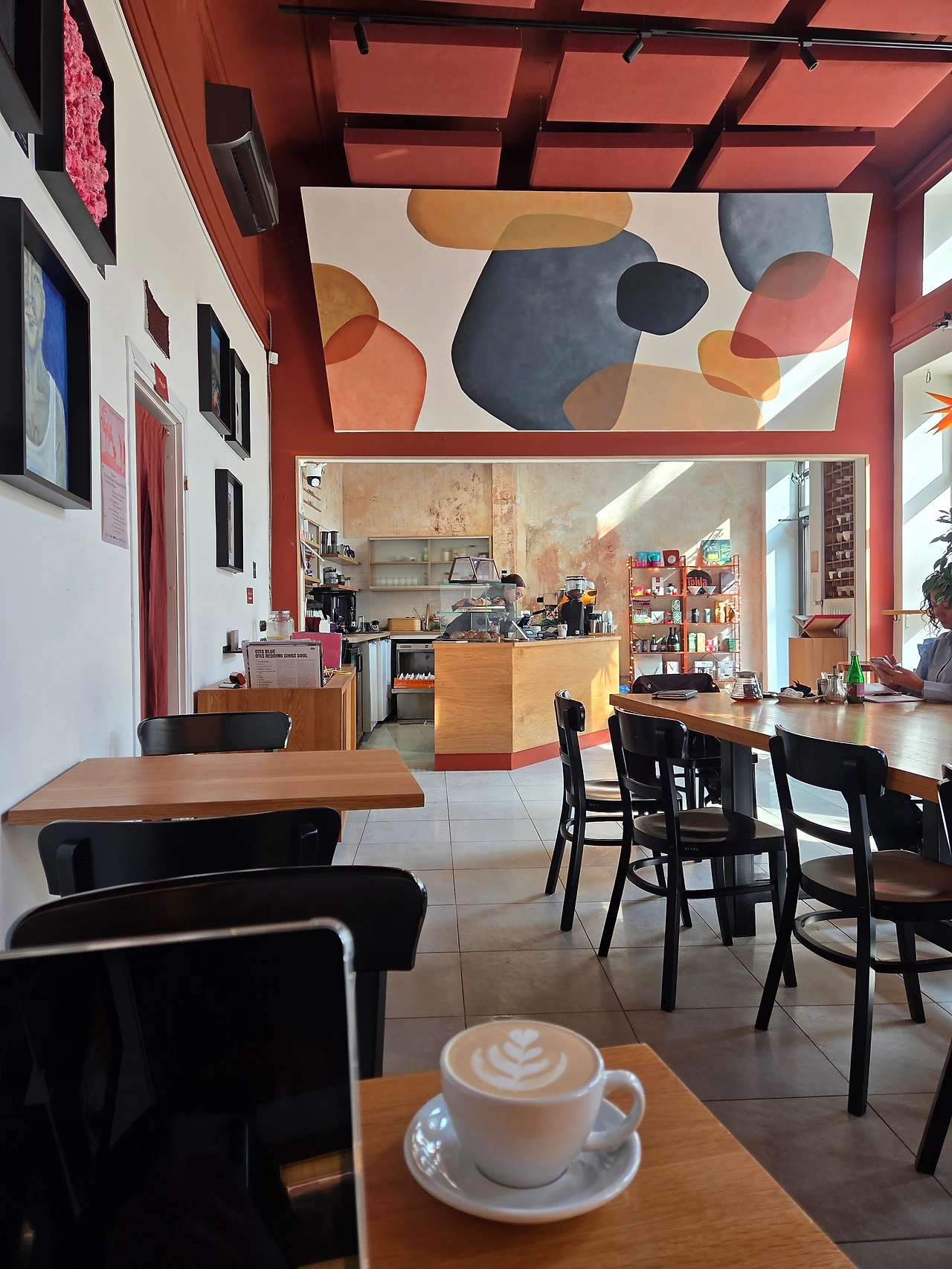 거의 2시간을 정원에서 독서를 하다가 나는 갑자기 커피를 마시고 싶어서 한 카페에 들어갔는데, 그곳은 정원에서는 조금 걸어야 하지만, 정말 예쁜 카페였다. 다양한 레코드판들이 줄지어 있는, 큰 카페. 카페를 감싸고 둥글게 나있는 작은 창들 틈새로 하얀 햇살이 들어오고, 폴란드 특유의 고소한 우유가 느껴지는 라떼는 내 맘에 작은 아트를 남겼다.