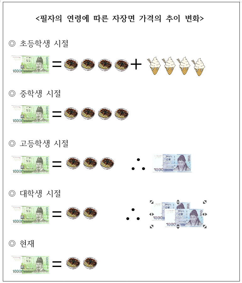 가령, 자장면 한 그릇이 2,000 원에 불가했던 필자의 초등학생 시절만 하더라도 만 원짜리 지폐 한 장이면 4인 가족이 자장면을 한 그릇씩 먹고도 2,000 원이 남아 후식으로 빵빠레도 사 먹을 수 있었다. 그러나 중학생이 되고 자장면의 값이 2,500 원이 되자 후식으로써 빵빠레는 포기할 수밖에 없었다. 그래도 그것은 그나마 나은 편이었다. 고등학생이 되어 3,000 원으로 오른 자장면을 만 원짜리 한 장으로 온 가족이 먹기 위해서는, 어느 유행가의 가사처럼 '어머니는 자장면이 싫다고 하셨어'란 상황이 연출되어야만 했고, 다시금 대학생이 되어 4,000 원이 되었을 때에는 아버지마저 '자장면은 싫다' 고 말씀하시는 비극이 악순환되었기 때문이다.