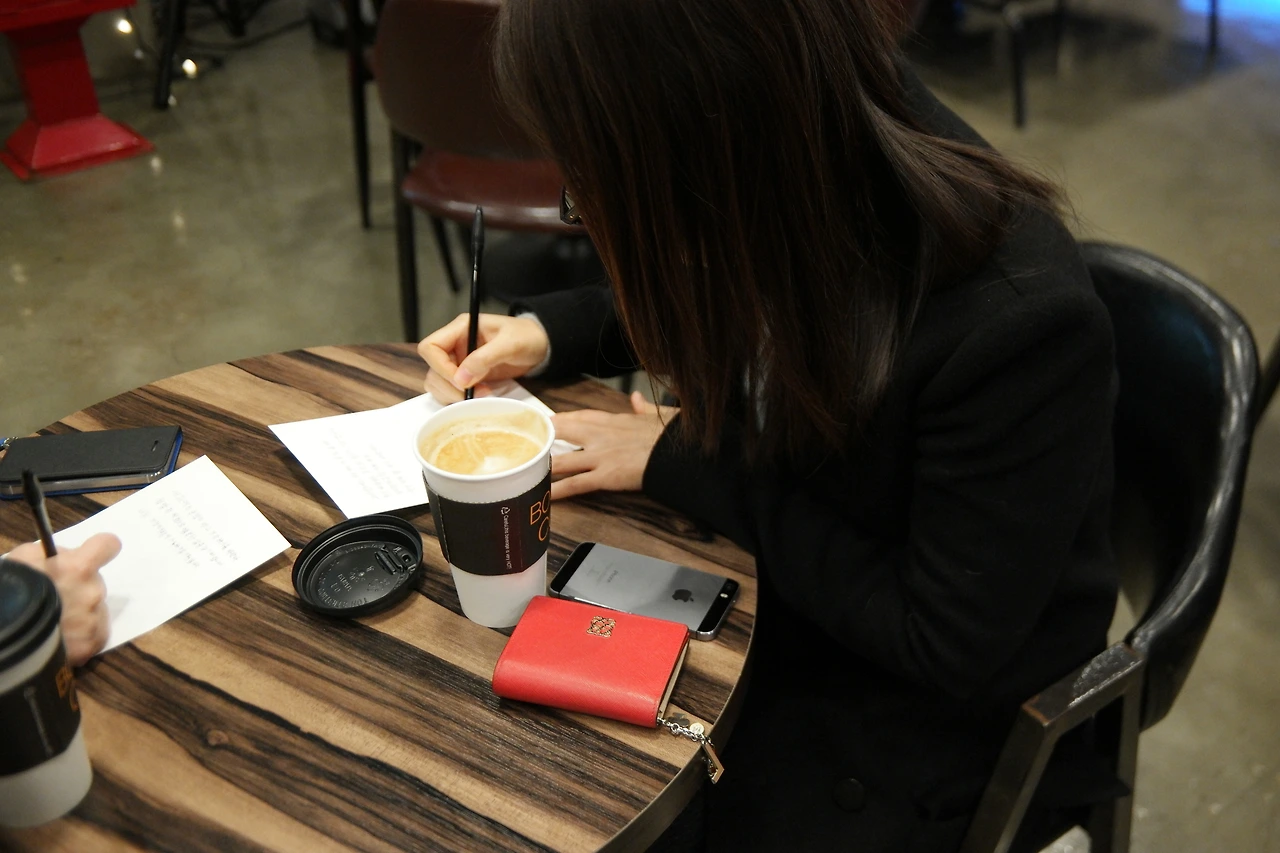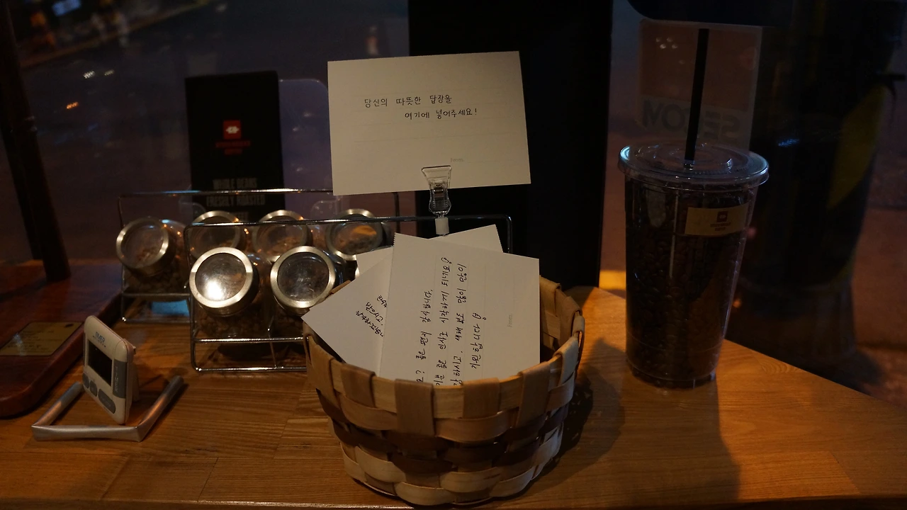 카페를 섭외하는 일은 조금 어려웠다. 조금이라도 사람이 많이 오는 카페를 찾고 싶었고 어떻게 하면 사람들이 거부감 없이 참여할 수 있게 만들까 고민했었다. 발품을 힘들게 팔아 카페 두 곳을 섭외했다. 그리고 우리는 작은 바구니를 여러 개 사서 메시지와 함께 펜과 엽서를 넣어두어 누구나 가져갈 수 있게 만들었고 커피를 시킬 때마다 우리가 직접 가져다주며 엽서를 함께 전달하기로 했다. 그리고 카페 안에는 작은 우체통을 준비하여 자유롭게 넣을 수 있도록 만들었다.