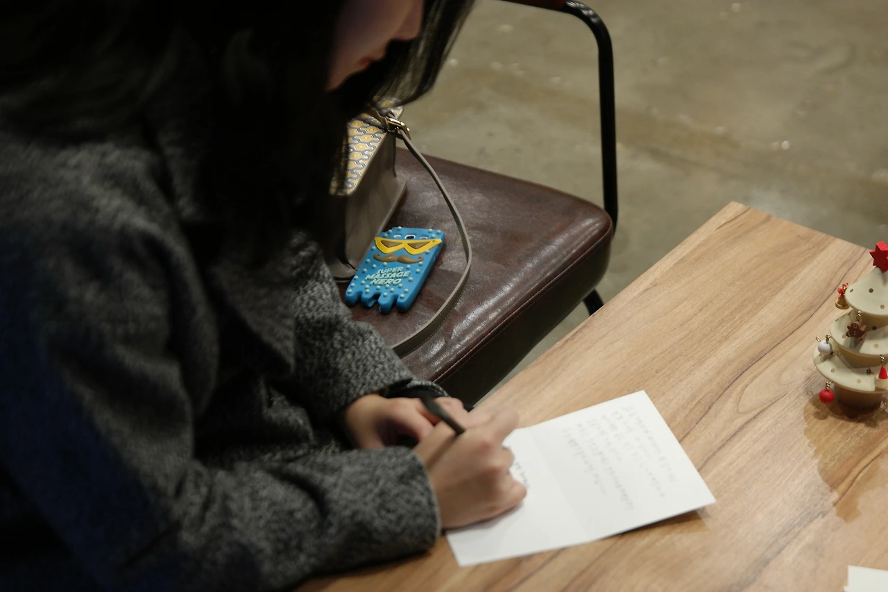 우리는 곧장 복지관의 문해교실에서 글이라는 걸 생전 처음 배우신 할머니, 할아버지들을 섭외했고 요즘 젊은이들에게 하고 싶은 말을 편지로 써달라는 부탁을 드렸다. 우리는 이 편지를 그림을 배우시던 어르신들의 그림과 함께 엽서로 만들어 카페에 배포하고 커피를 주문한 손님들에게 나누어주며 답장을 회수하기로 했다.