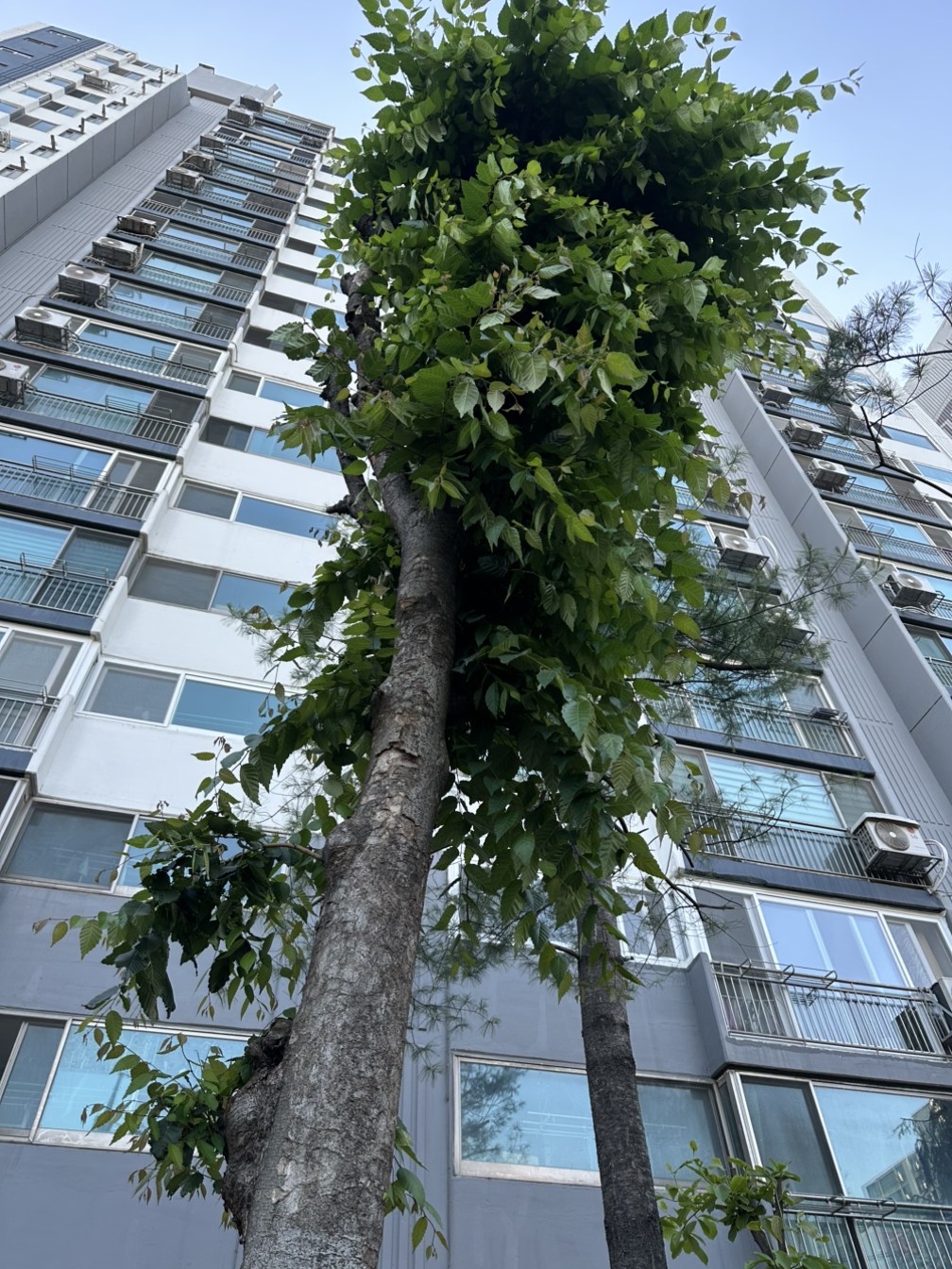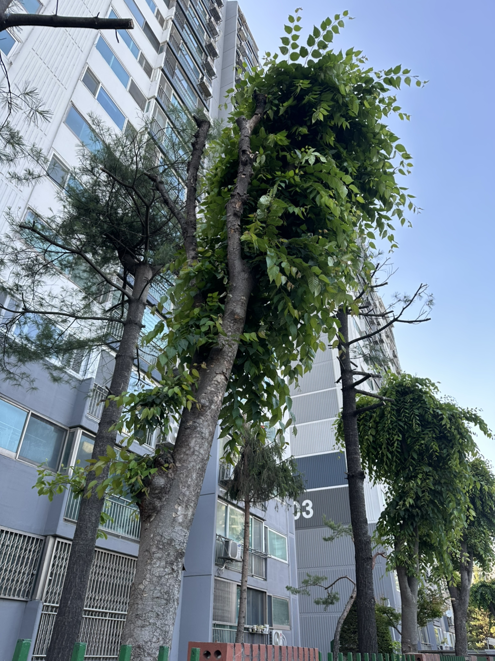 처음 한 녀석을 보았을 때는 어디가 아픈 것일까 했는데 이 동네 아파트의 나무들이 모두 이 모양이더라.