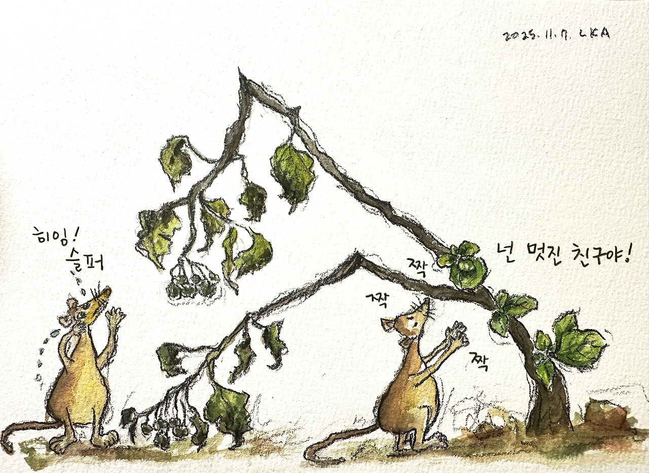 엊그제 그러니까 그가 꺾인 지 보름이나 지나서야 거기로 향했다. "허허... 너 미쳤구나." 실소를 참을 수 없었다. 그가 벌떡 일어선 것은 아니다. 줄기는 아예 물기조차 느껴지지 않았다. 쪼그라든 잎은 곧 바스러질 것 같았다. 열매는 자세히 살펴야 그 형체를 알아볼 수 있었다. 그런데, 그가 참으로 부질없는 짓을 하고 있었다.