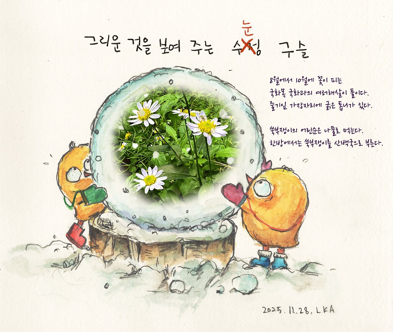 바로 옆동에 군락을 이뤄 살 정도면 한 두 해를 산 것이 아닐 텐데, 올 가을에야 제대로 보았다. 개망초와 헷갈렸다 변명하기엔 꽃의 크기나 색깔이 달라 궁색하다. 헷갈린 것은 단 한순간도 실재한 적 없는 AI도 마찬가지였다. 벌개미취라고 했다가 구절초라고도 했다가 사진을 보여줄 때마다 내어 놓는 답이 달랐다. 식물도감 여러 권을 펼쳐 생김에 관한 설명을 읽고 내가 찍어 온 사진과 비교했다. 잎이며 줄기를 만져 잔털이 있는지의 유무도 살폈다. 꽃잎의 개수도 세어볼까 하다가 이는 한 가지로 정해진 것이 아니라 하기에 그만두었다. 대단한 연구자가 되기라도 한 것처럼 요란스럽게 알아낸 것이 고작 풀이름 "쑥부쟁이"이다.