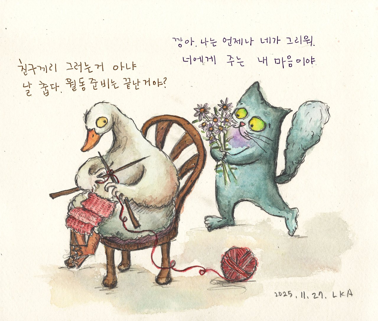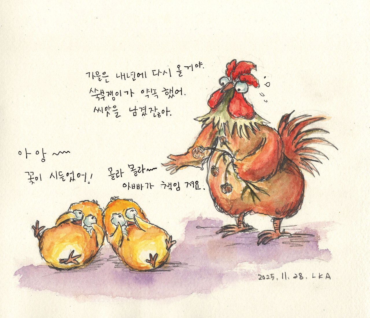 이듬해 가을, 절벽 아래 쑥부쟁이 죽은 자리에 꽃이 피었더래. 쑥부쟁이꽃, 가을 내내 연한 보라색 꽃잎을 활짝 펼쳐 흔들며 '오늘은 오려나?' 기다리겠지. 차가운 서리도 피하지 않고 가을 끝자락까지 버티는 꽃이야.