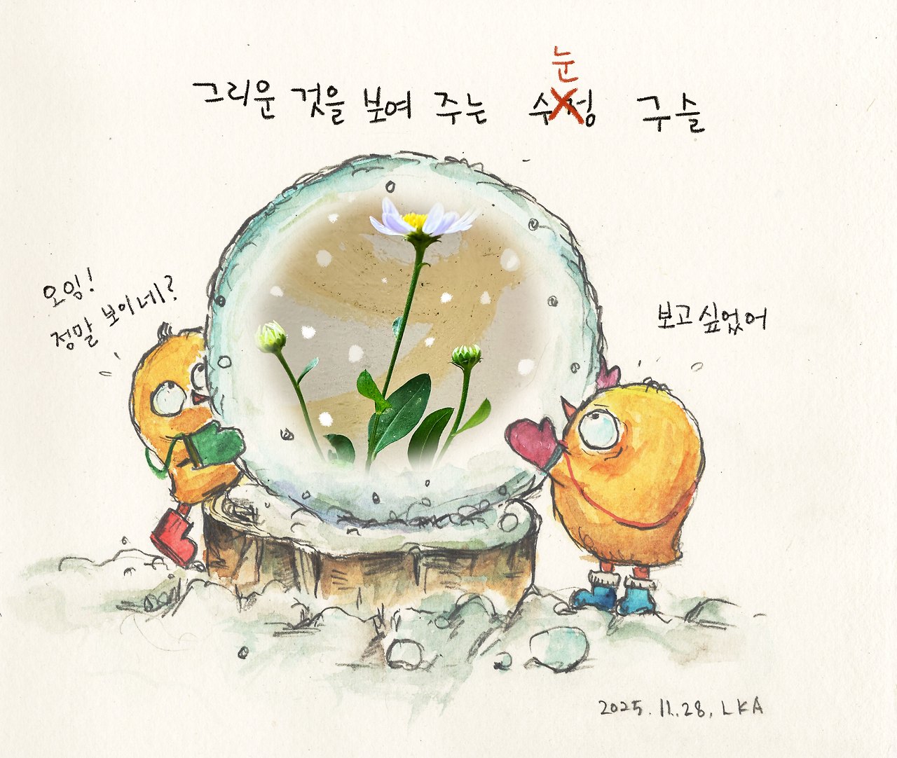 뭐라도 해야겠구나 싶어서 쑥부쟁이는 매일 빌었다지. "제발 만나게 해 주세요." 오! 세상에, 정말로 산신령이 그녀 앞에 떡 하니 나타난 거야. 몇 해전 구해 주었던 노루, 알고 보니 그가 산신령이었대. 소원을 들어달라는 그녀에게 산신령은 구슬 세 개를 주더래. 다들 눈치챘겠지? 이 이야기의 끝을 말이야. 꼭 이런 식이야. 목숨 구해주었더니 들어 달라는 소원 즉시 들어주지 않고 수수께끼처럼 구슬 세 개가 뭐야? 말로는 소원 세 가지를 들어주겠다고 하는데...