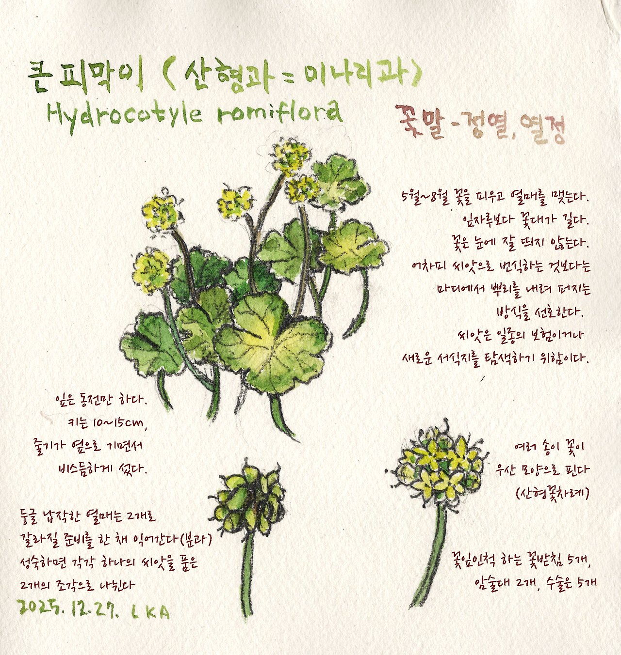 피막이 풀은 주로 경기 이남의 따뜻한 지역을 좋아한다고 한다. 자료를 찾아보니 제주에 살고 있는 피막이 풀에 대한 이야기가 많다. 이들 지역에서 피막이 풀은 사계절 내내 푸르다. 안타깝게도 내가 사는 곳의 겨울은 꽤 춥다. 어쩌다 날아온 씨앗이 그럭저럭 살만한 곳이라 여겨 생태를 이루었을까? 잘 모르겠다. 군락의 크기로 보아 여러 해를 살아 낸 모양이다. 이제야 너를 알아본 것이 못내 아쉽기도 하지만 이제라도 너를 알게 되어서 다행스럽다. 네가 잠시 내어 준 그 땅에는 뱀딸기와 별꽃이 신이 났더구나. 따뜻해지는 날 보자꾸나. 너도 날 잊지 않고 불러주겠지? 에메랄드 빛 찬란한 왕국으로 말이야.