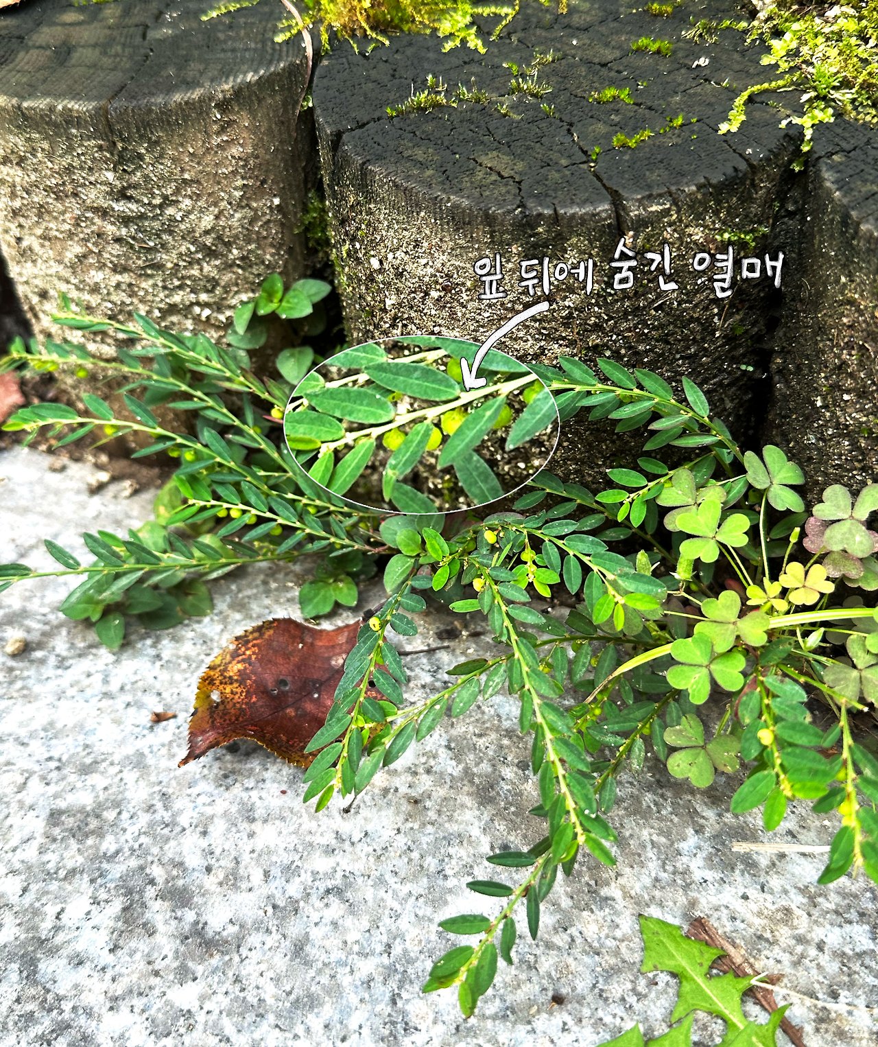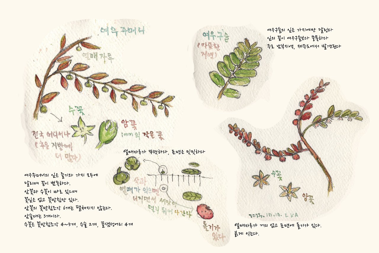 그를 만나기 전까지는 단순한 호기심이었다. 이름이나 좀 알아보자 하는 정도였으니까. 어떤 이는 이름 없는 풀들이라 했다. '그럴지도 모르지. 잡초라면......' 무책임하게 끄덕였었는데 참 부끄럽게도 나의 무지였더라. 모두들 이름이 있었다. 몇몇 풀의 이름을 알게 되자 재미가 붙었다. 그래서 틈 날 때마다 아파트 화단을 돌며 살폈다. 그때 만났던 풀이다. 자귀나무 잎을 떠올리게 하는 풀잎이었는데 얇고 길쭉한 잎이 일정한 간격을 두고 줄기에 달린 모습은 어렸을 적 기억을 떠올리기에 충분했다. '될까? 안될까?' 잎을 떼며 점을 치던 풀을 닮았다. 화단의 경계를 걸치고 넘어 구석지고 그늘진 곳에 보일 듯 말 듯 수줍게 자리 잡은 그를 살피려고 쪼그려 앉았다. 손대면 잎을 접는 미모사인가 싶었는데 그것은 아니었다. 만져도 보고 살짝 비비어도 봤는데 아무런 반응이 없었다. '아쉽네.' 일어나면서 무심코 잎을 쓰다듬었다. 그 바람에 양 옆으로 어긋나게 달린 잎의 뒤쪽을 보게 되었다. 이상한 것이 쪼르르 달렸다. 팥알보다 작고 좁쌀보다는 큰 것이 실에 꿰어 목걸이 만들며 놀던 구슬 같았다. 그 생김이 어찌나 재밌고 예쁘던지 일어서려다 말고 다시 주저앉아 사진을 찍었다. 얘는 대체 누굴까? 여기저기 물었다. 누구는 '여우구슬'이라고 했다가 또 누구는 '여우주머니'라고 했다. 그 방면으로는 앎이 초라한 나는 그저 이름이 두 개네 했다. 집으로 돌아와 도감을 펼쳤다. 어, 이상하다. 둘 다 있다. 둘 다 대극과의 식물이기는 하지만 따로 구분해 놓은 것을 보니 다른 풀인가 본데 아무리 살펴도 내가 본 풀이 여우구슬인지 여우주머니인지 도통 모르겠다. 한숨이 나왔다. 그만할까? 하는 생각이 없지 않았지만 오기가 발동해 끝까지 가 보기로 했다. 연필을 쥐고 노트 위에 하나하나 적기 시작했다. 잎의 생김, 열매의 생김 등을. 그리고 마침내 알아내고야 말았다. 내가 보았던 풀은 '여우주머니'였다. 어렵사리 알아내고 보니 내가 참 대견스러웠다. 이럴 때 남편과 아들은 나의 제물이다. 그들은 '여우주머니'와 '여우구슬'이라는 풀을 들어 본 적 있는가부터 시작해서 이 둘을 구별 짓는 점이 무엇인지, 우리 동네에 이렇게나 대단한 풀이 산다는 등의 설명을 저녁 내내 그리고 이튿날 아침까지 들어야 했다. 시간으로 길들인 탓일까? '여우주머니'가 달리 보였다. 보호본능을 자극하는 여리여리한 잎의 생김이며 그 뒤에 숨겨 놓은 열매까지 모든 것이 특별했다. 그때 친구라는 낱말을 떠올렸다. 풀친구, 우리 동네 풀친구.