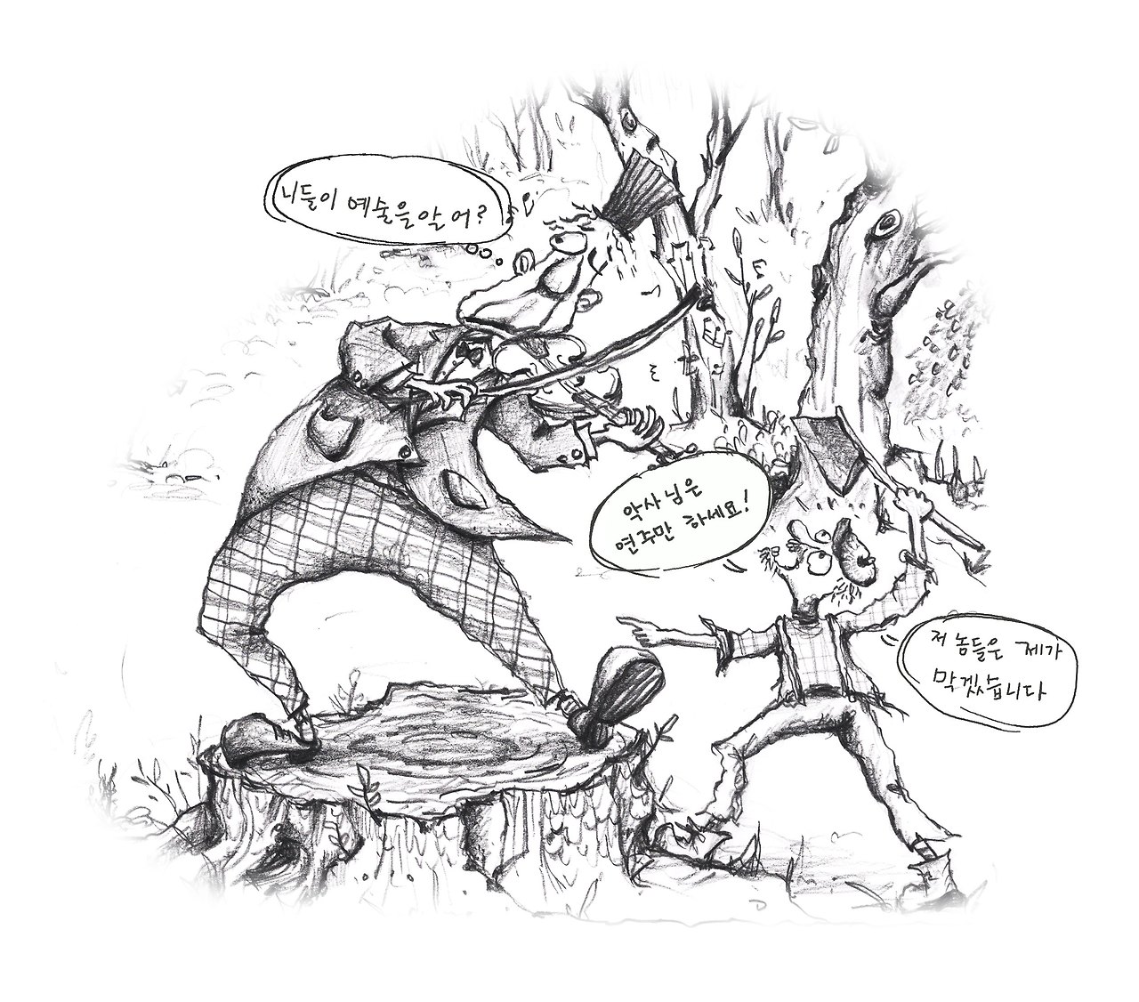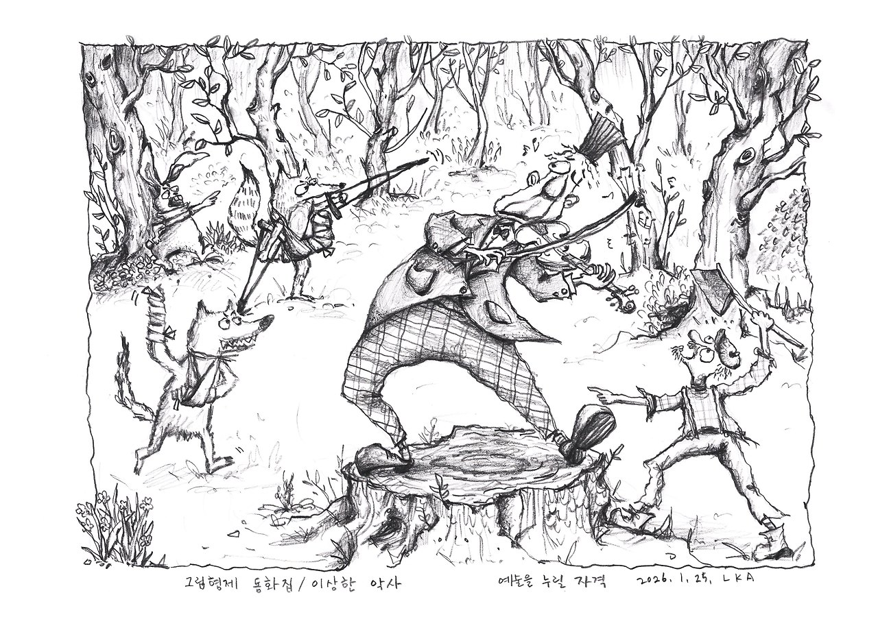 옛이야기의 해석은 저마다 다를 수 있고 또 그래야 한다. 그래서 위의 글 역시 나의 생각일 뿐이지 정답은 아니다. 그저 나는 악사의 맹목적인 팬이 된 나무꾼의 광기 어린 난동에 쫓기는 동물들이 어느 순간 서로를 바라보며 한바탕 자지러지게 웃었을 것 같다.