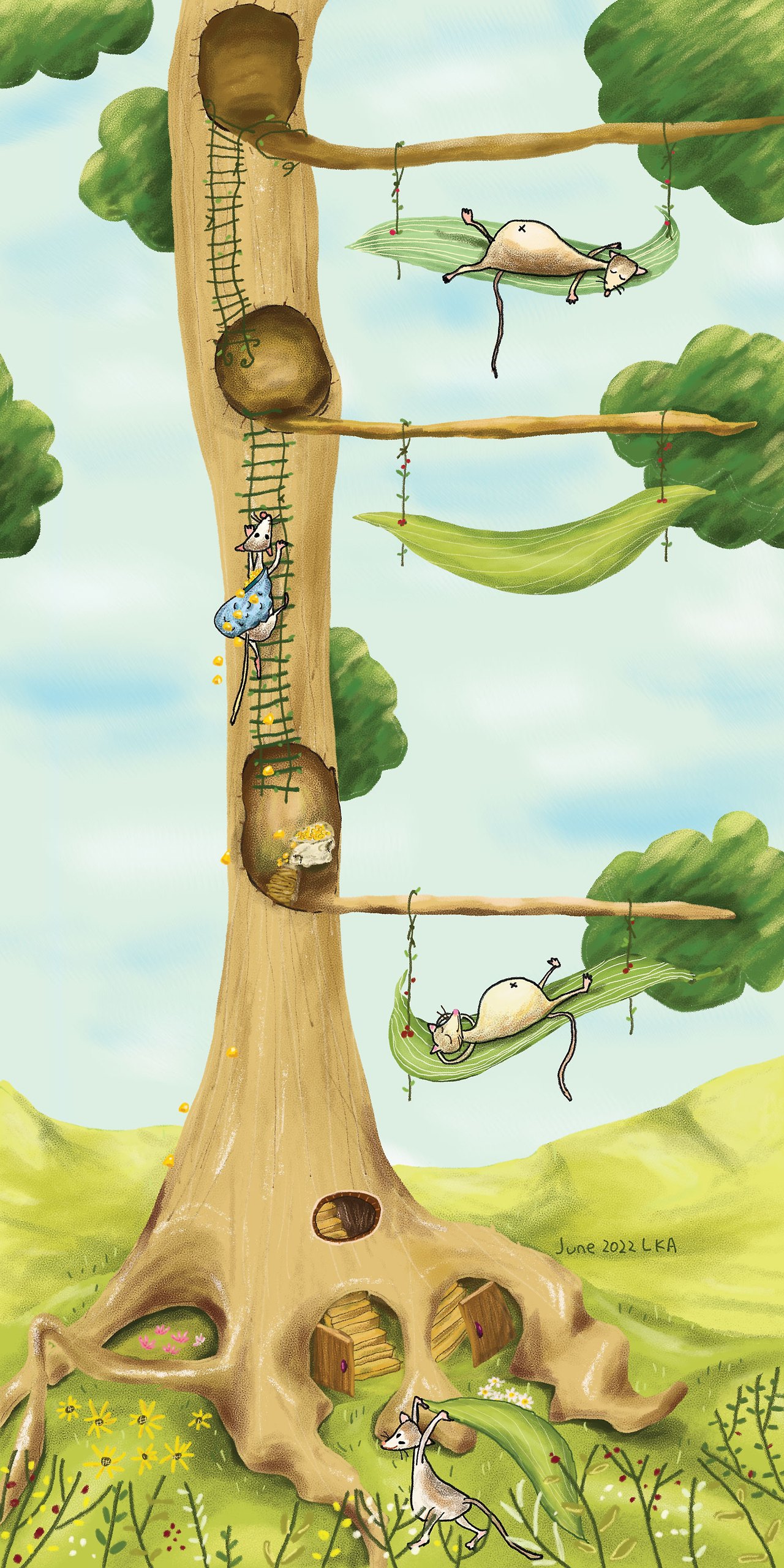 그래서 나무 그늘 아래 흔들흔들 옥수수 껍질 침대를 만들 거야.