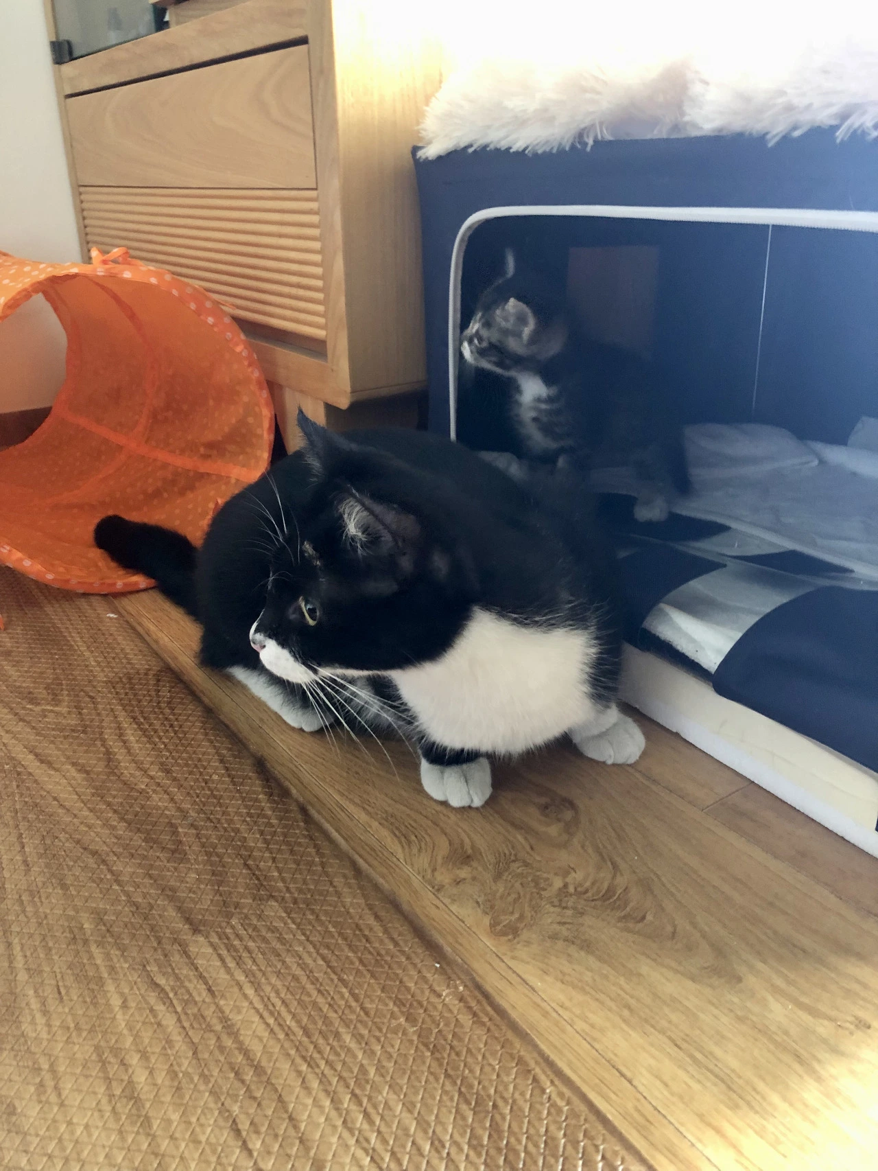 까미는 원래 3마리를 낳았다. 비를 피해 지하주차장 여기저기를 옮겨 다녔다. 그런 과정에서 새끼 한 마리는 별이 되었다. 60대의 여성이 별이 된 아이를 손수 묻어주었다. 그러고도 불안했는지 까미는 주차장 이쪽 끝에서 저쪽 끝으로 계속 자리를 옮겼다. 그 과정에서 또 한 마리를 놓쳤고 다행히도 이번에는 젊은 부부가 그 아가를 발견했다. 젊은 부부는 아가를 집으로 데려가 직접 인공포유를 하며 키웠다. 그래서 까미에게는 새끼 한 마리만 남았다.