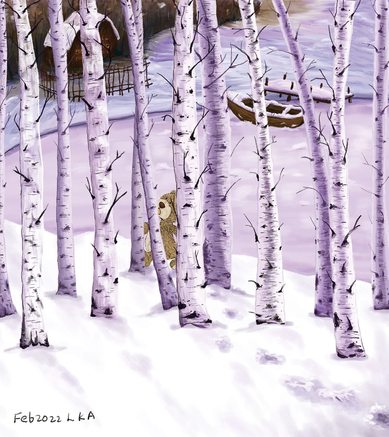호수 건너편엔 작은 나룻배가 꽁꽁 얼어붙은 호숫가에