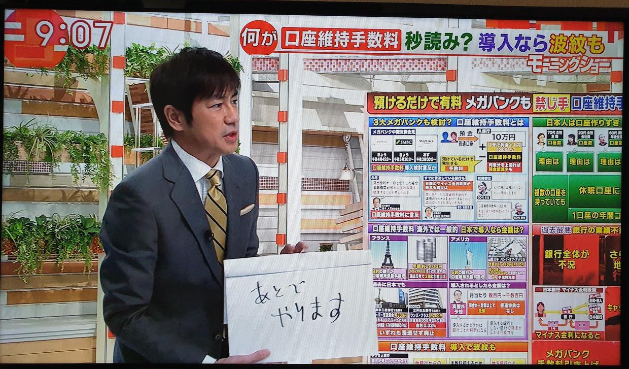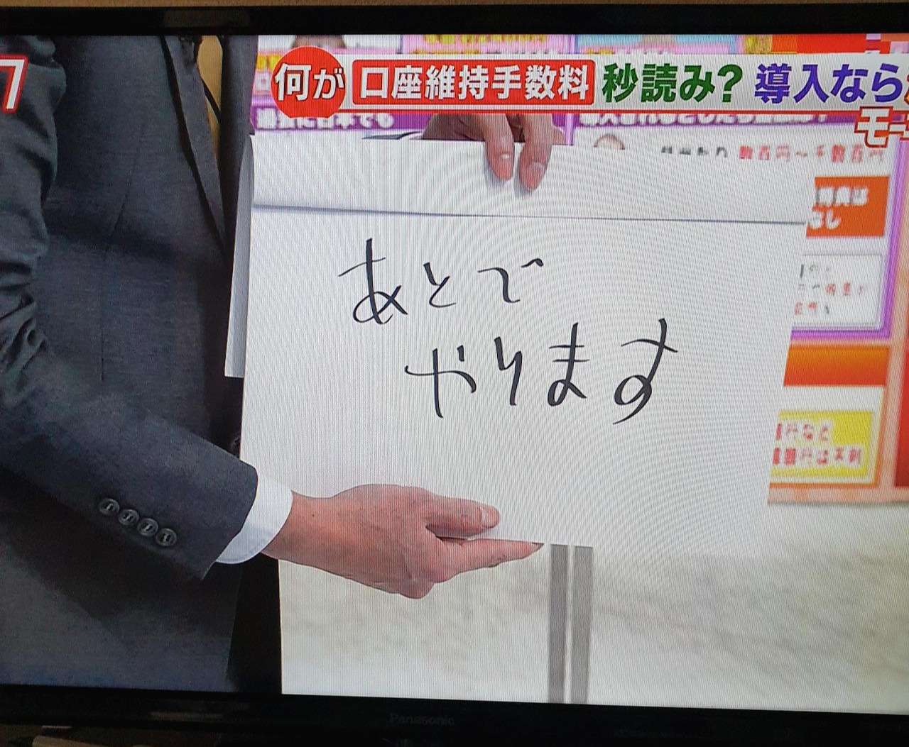 TV 보다가 찍은 사진. 생방송 중 패널이 발언하는데, 중간 광고시간이 임박하자 진행자가 '좀 이따가 하겠습니다'고 쓴 메모를 패널에게 내보이며 다급하게 멘트를 끊고 있다.