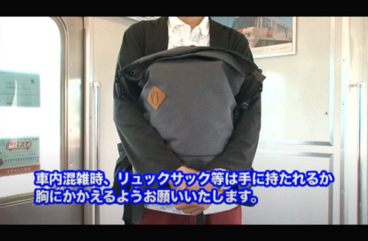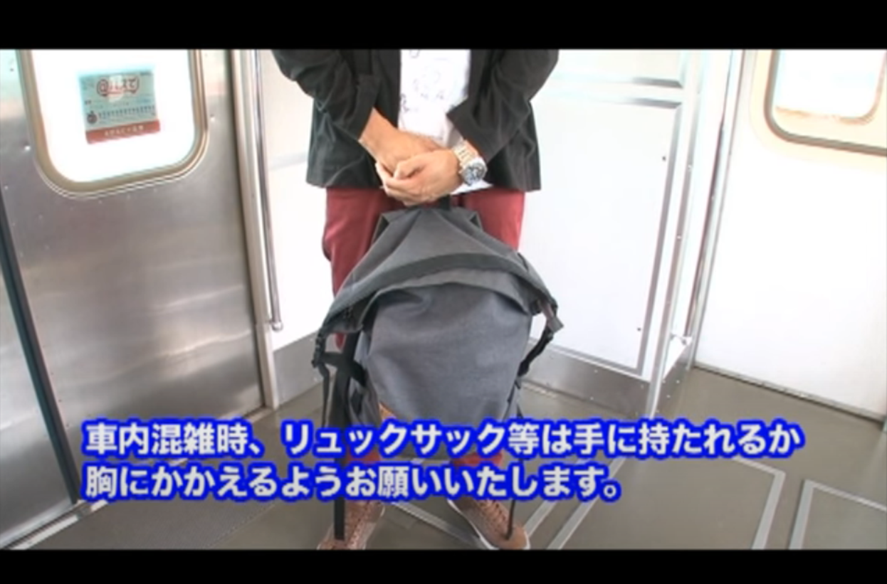 일본 지하철을 타면 백팩을 맨 사람들이 대부분 이렇게 가방을 자신의 몸 앞쪽으로 들고 있다. 사진은 서일본철도주식회사가 2016년 만든 영상 유튜브 캡쳐.