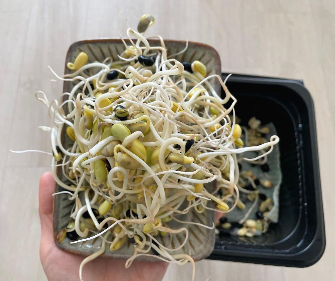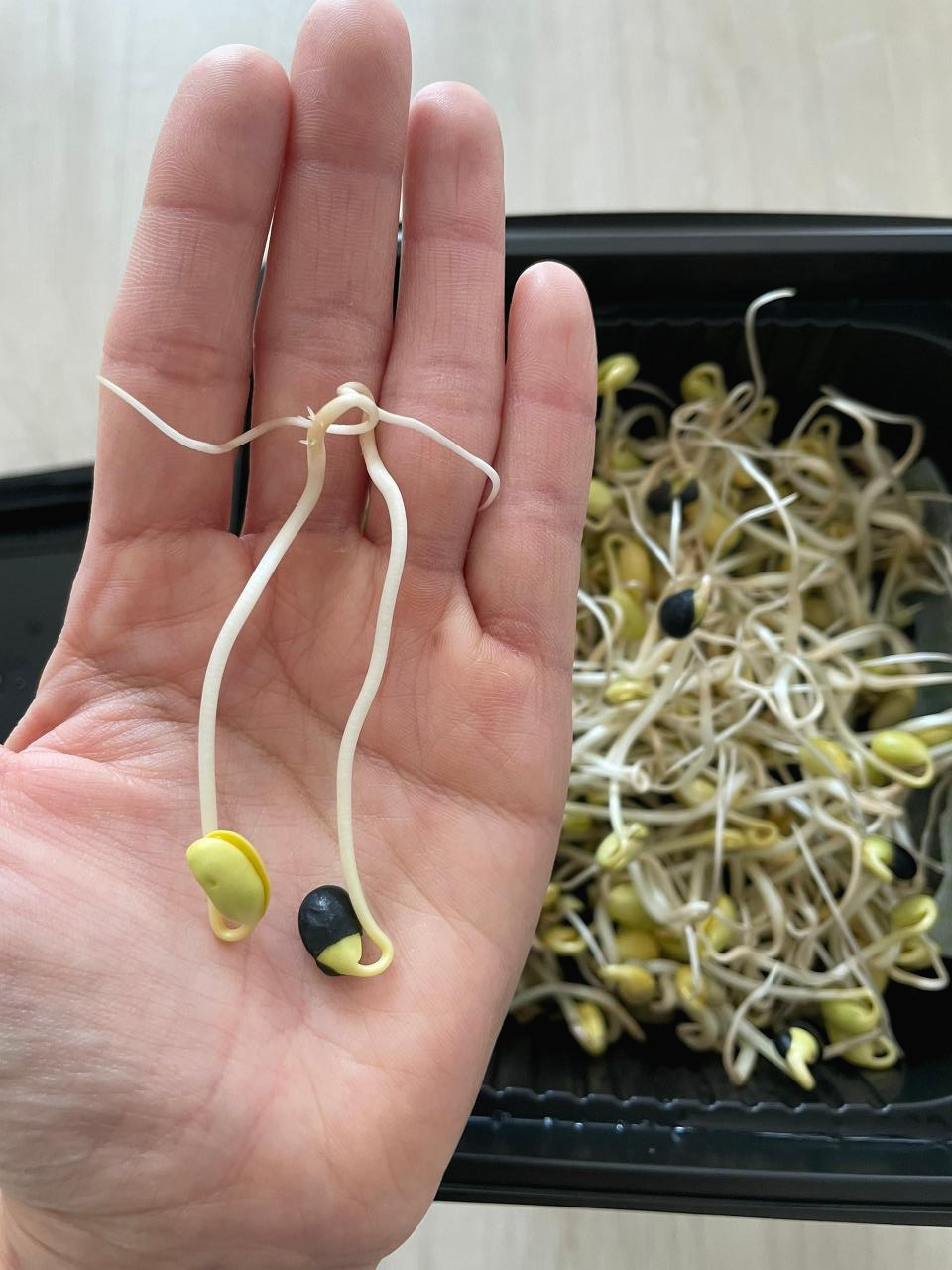 내 재배기는 가로세로 약 13cm 정도로 여기서 수확한 콩나물은 딱 1인분 정도. 혼자 한 끼로 뭔가를 해 먹기엔 적당한 양이다. 사실 콩을 많이 넣었다고 생각했는데, 다 자란 콩나물을 걷어내다 보니 그 아래 ‘제대로 못 큰 녀석들’이 있었다. 발아하다가 다른 콩에 눌리거나 물에 너무 많이 불어서 썩은 아이들이었다. 나름 한 곳에 몰리지 않게 물을 줄 때 신경을 썼는데… 미안하네. 그래도 생명 끈 부여잡고 단단하게 싹을 살짝 내밀고 있던 콩 세 개는 따로 잘 꺼내서 ‘2차 재배기’(그렇다, 한 번으로 끝낼 수 없어서 또 재배를 시작했다)에 넣어뒀다. 첫 공간에서는 성장이 조금 더뎠던 친구들이지만, 지금 공간에서는 단연 돋보이는 키다리다. 그래, 각자 페이스로 자라나면 되는 거야.