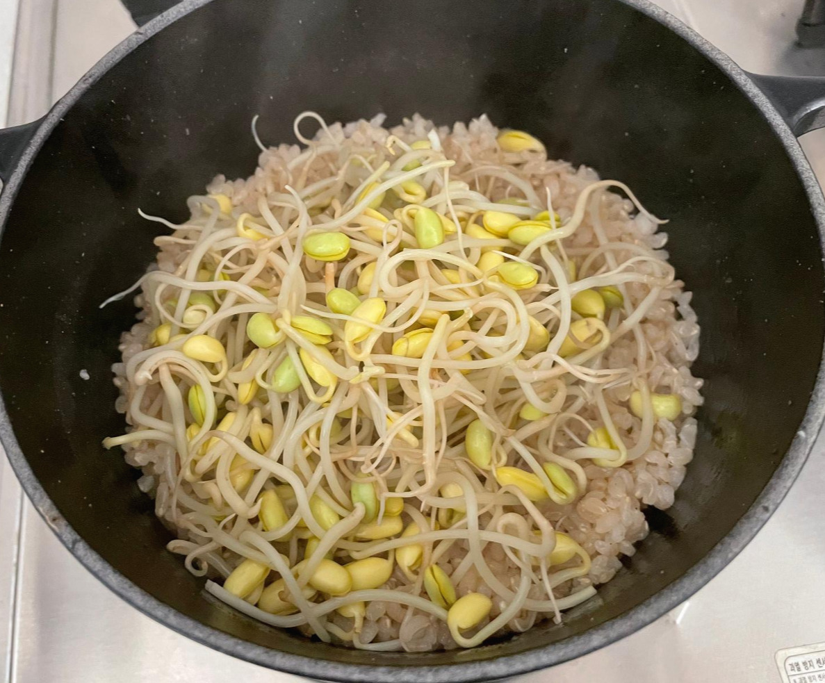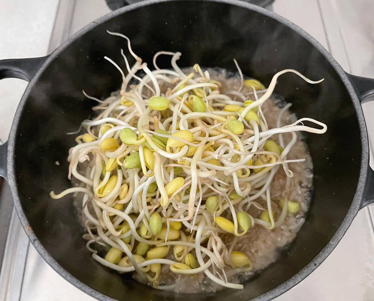 4. 밥이 어느 정도 익었다 싶으면 그 위에 콩나물을 얹고 뚜껑 닫고 7분간 약불로 끓인다