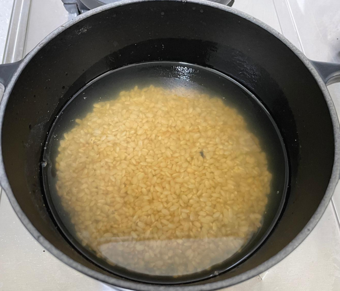 1. 식힌 육수에 불려둔 쌀을 넣고 3분간 강불에서 끓인다