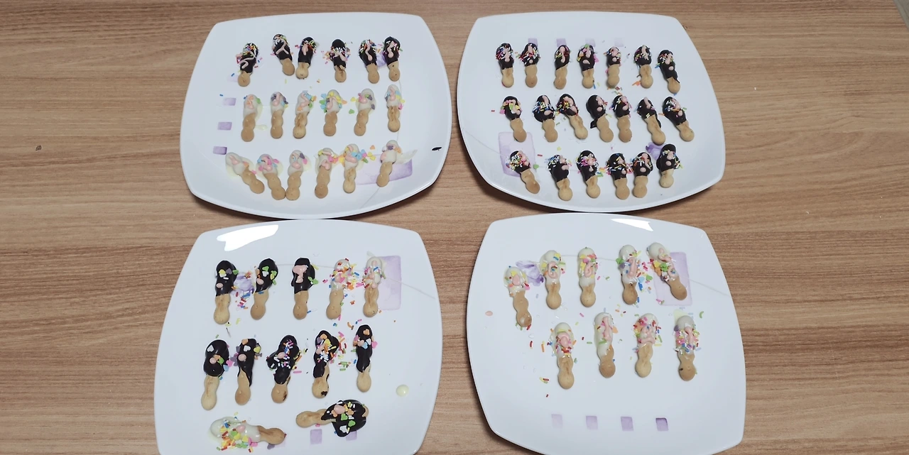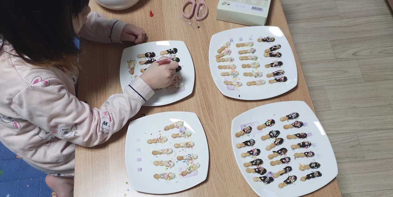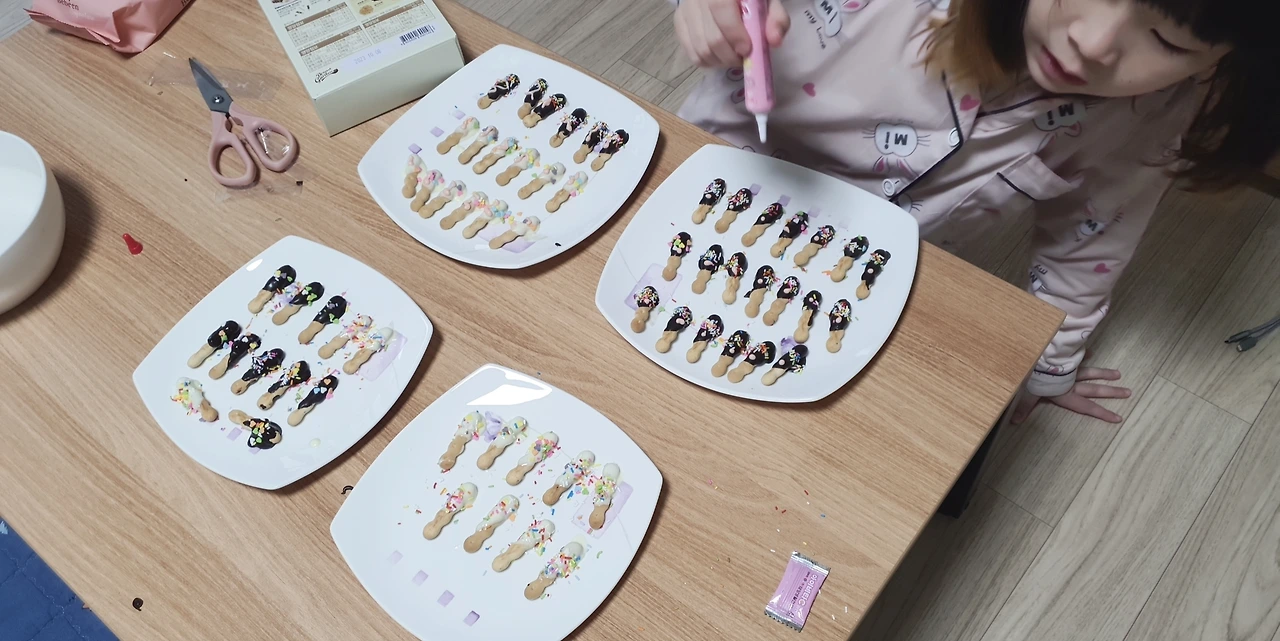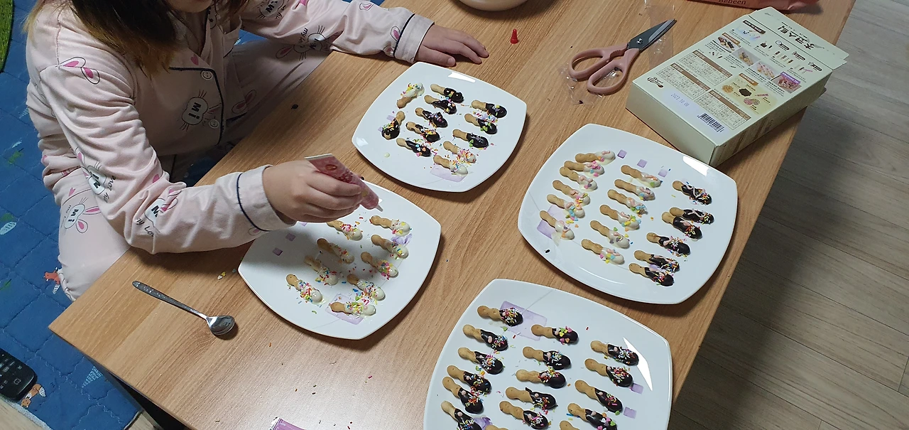 아이가 토핑을 하는 동안 얼른 커피를 믹스커피 한봉을 타온다 접시에 딱 붙은 막대과자를 살짝 옆으로 틀자 깔끔하게 떨어져 나온다 아이와 내가 먹을 과자 두 개를 빼고 나머지는 비닐팩에 남아 냉장고에 넣어둔다 내일 친구들이랑 나눠 먹으려면 녹으면 안 되니까