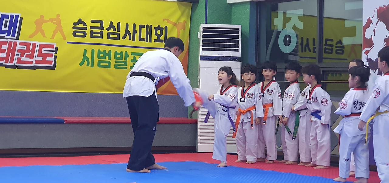 그 다음은 사범님들의 격파 시범이다 합판 조각들이 하늘을 날아다니며 부서진다 감탄사가 절로 나온다 엄마 아빠 아이들의 박수갈채가 이어지고 마지막으로 아이와 함께 하는 격파시간 아이 앞에서 부모님들이 합판을 들고 아이가 발차기로 내려치면 부서지게 된다 공주님의 야무진 발차기에 합판이 산산조각 난다 잘했다고 안아준다 멋지다고 쌍따봉을 날려주니 아이가 배시시 웃는다