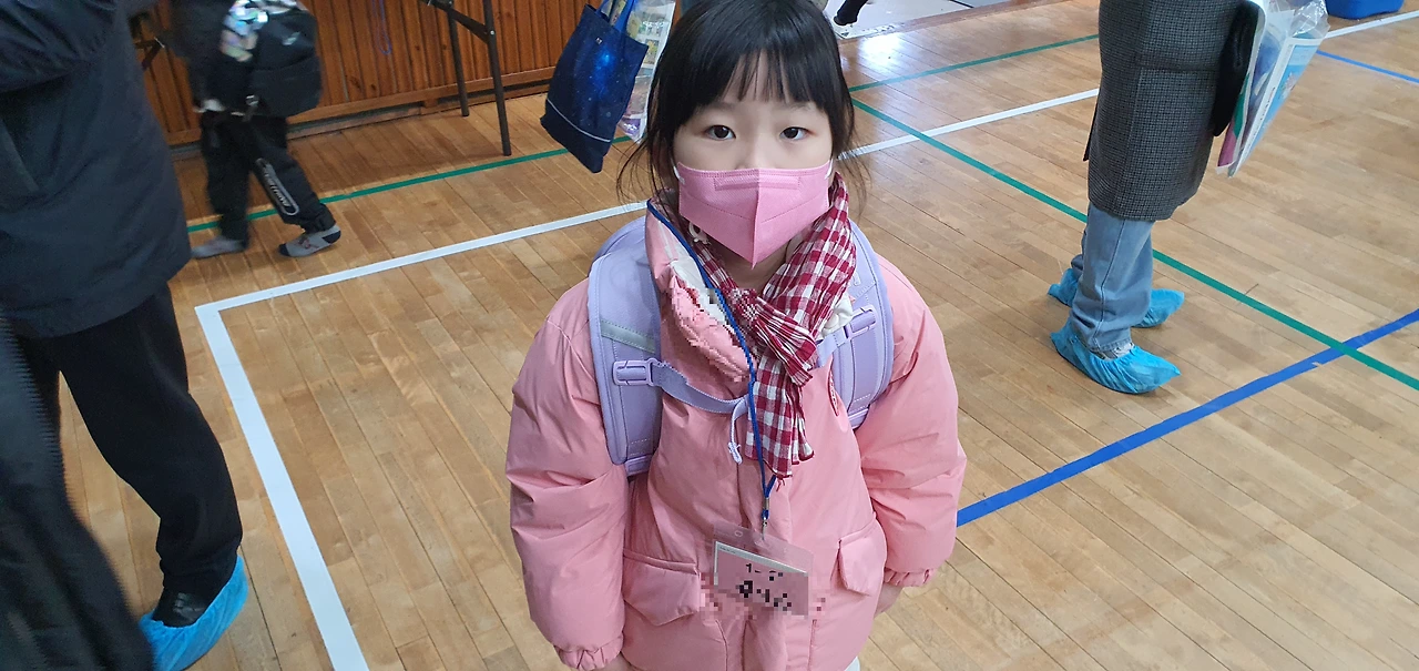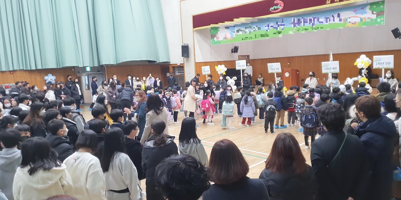 아이가 가리킨 손가락을 바라보니 1학년 2반 OOO이라고 적혀있다 행사는 강당에서 시작된다 아이에게 실내화로 갈아 신기고 나도 덧신을 신고 강당으로 입장을 한다 200여 명 정도 입학 한다고 들었는데 200여 명이 아니라 100여 명 정도인 듯했다 한 반에 20명씩 다섯 반이다, 나 어렸을 적만 해도 학교 운동장에 8반 9반에 한 반에 40명씩이었던 거 같은데 조촐해진 입학식에 참 세상이 많이 변했구나 싶다