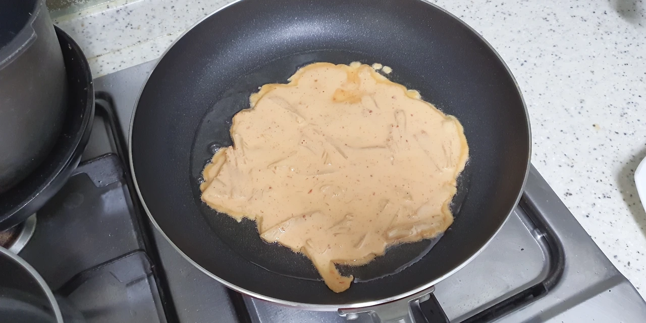 어머니가 주신 익은 김치를 물에 살짝 행군 후에 잘게 썰어서 계란푼 밀가루 반죽에 넣고 잘 섞어서 커다란 프라이팬을 잘 달군 후에 기름을 듬뿍 두르고 한 두세장 붙여 안 매운 부분은 공주랑 나눠 먹기로 한다
