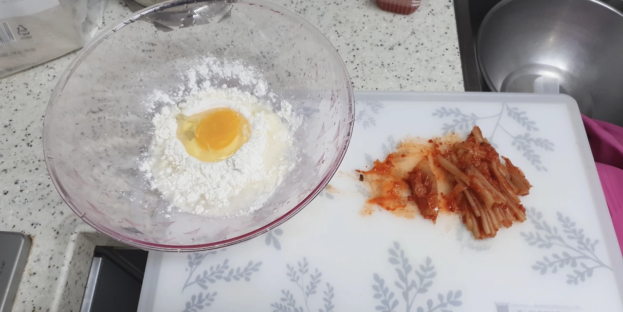 "김치전인데, 이따 한번 먹어봐요 안 매운 부분으로 아빠가 파전하려고 그랬는데 재료가 없어서 오늘은 김치전이에요."