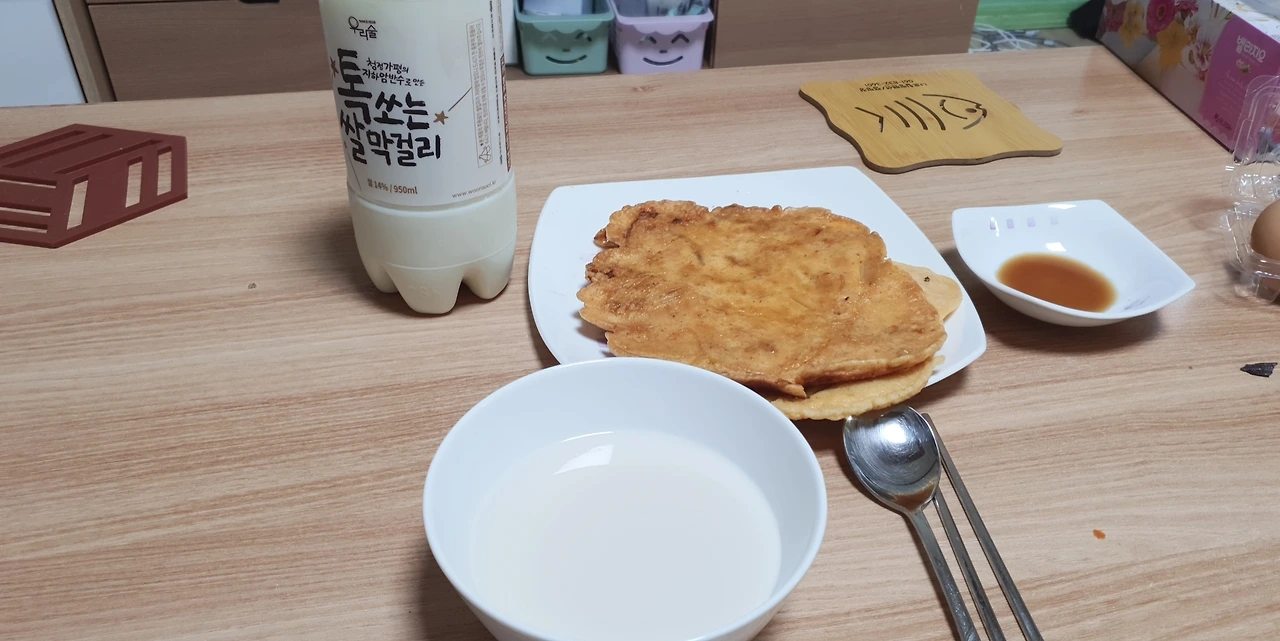 나도 막걸리 한잔을 따라서 전과 함께 한입 한다 톡 쏘는 듯한 막걸리의 맛과 부드럽지만 살짝은 매콤한 전의 맛이 입안을 맴돈다, 다시 한 번 더 전을 큼직하게 뜯어 간장을 푹 찍고 입안에 넣는다 이런 게 소확행이지, 그래도 술은 너무 많이 마시진 말아야지 딱 한잔만 더하고 그만 마셔야지