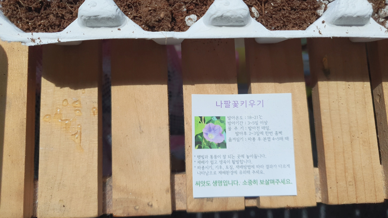 계란판에선 두개만 피어서 미니 화분으로 옴겨 심어줘서 지금은 총 아홉송이의 나팔꽃씨가 자라고 있다