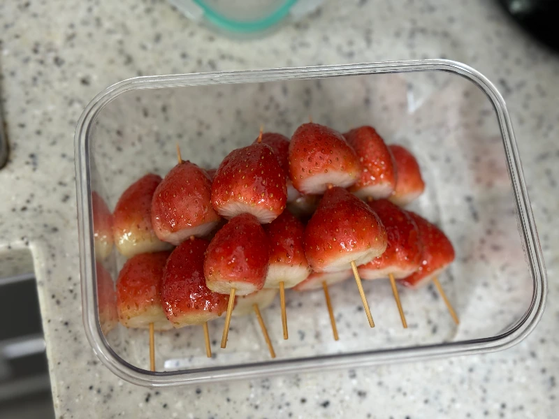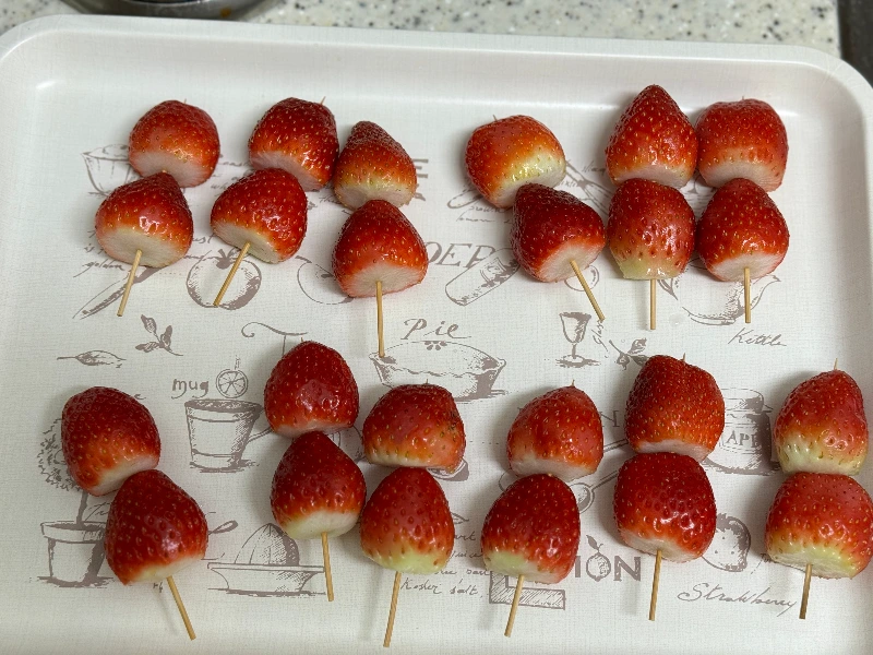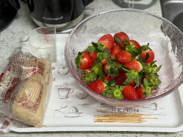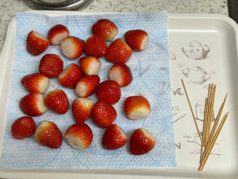 집에 있던 음식용 꽂이를 준비하고 딸기를 씻으며 꼭지를 딴다, 물기를 바짝 빼라고 해서 냅킨을 바닥에 한 장 깔고 그 위에 꼭지 딴 딸기들을 내려놓는다, 그리고 냄비에 물과 설탕의 비율은 1:2로 맞추고 약불로 끓이기 시작했다, 인터넷에 보니 저으면 안 된다고 그래서 가만히 놔두고 물기를 뺀 딸기를 꽂이에 두 개씩 꽂아서 쟁반 위에 올려 두었다