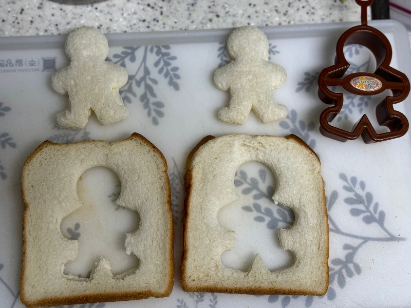 빵에 모양을 낼 수 있는 틀로 모양을 만들어 낸다 파진 모양은 아이 입에 넣어준다