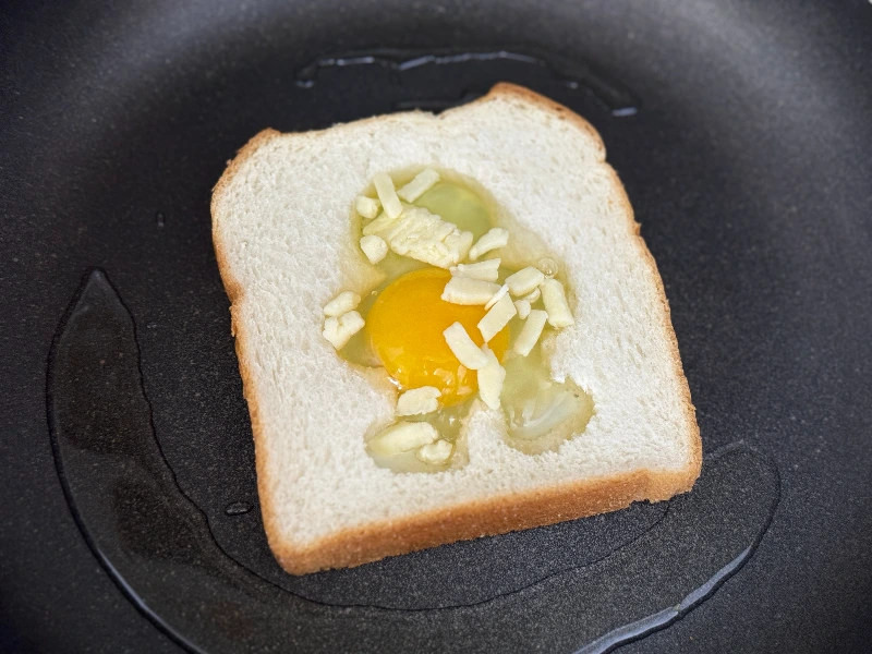 프라이팬을 약불로 데우고 기름을 살짝 두른후(버터로 해도 좋다) 빵을 올린다, 그 후에 계란을 파진 곳에 깨서 넣고, 그 위에 모차렐라 치즈를 얹는다,