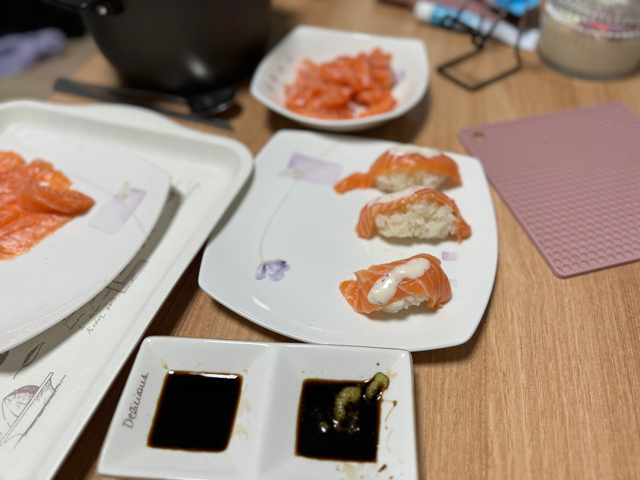 다음에 다시 해주겠다는 공주와 새끼손가락을 건다 공주가 만들어준 초밥 밥은 많고 연어는 조물 거려서 왠지 모르게 따듯한 거 같지만 생각보다 맛이 있었다 밥 위에 얹어진 고추냉이와 연어 그리고 그 위에 타르타르 소스까지 모양은 어설프지만 공주의 온 힘이 여기에 들어있는 것 같았다 아이에겐 매번 아빠가 해준 밥에서 벗어나서 스스로 해보는 것도 재미있었던 거 같아서 다행이다