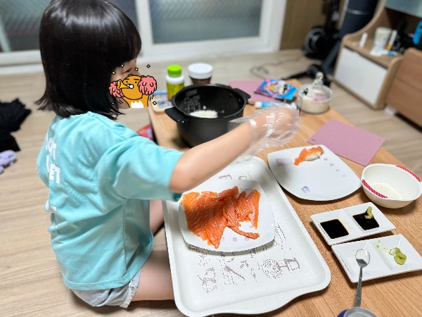 예상외의 포인트에 꽂히셨는지 자기가 만들어 주겠단다 아이 손을 씻기고 식탁에 앉아 아빠는 연어를 썰고 아이는 밥을 조막만하게(?) 뭉친다 그리고는 고추냉이를 살짝 얹고 그 위에 내가 잘라준 연어를 올려 꾹 누른다 그리고는 그 위에는 타르타르 소스를 한 수저 뿌리고 접시 위에 하나씩 올리기 시작한다
