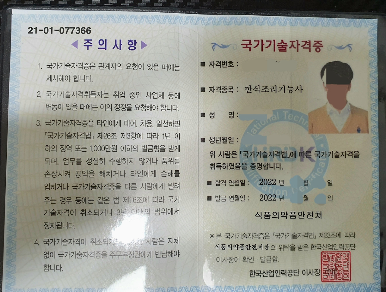 22년도에 한식자격증을 땄다